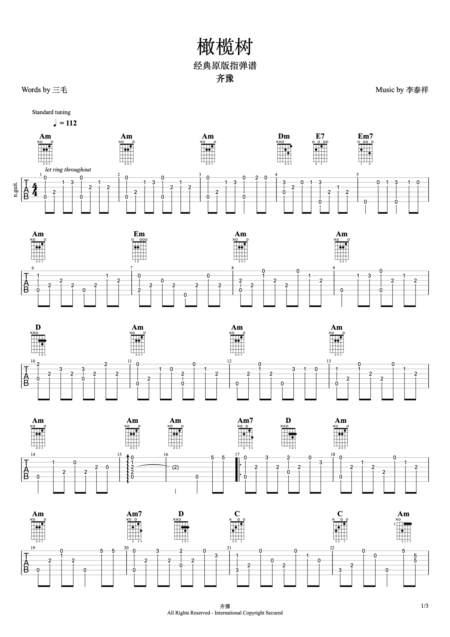 曲谱介绍: 齐豫《橄榄树》吉他谱_C调吉他独奏谱_简单原版