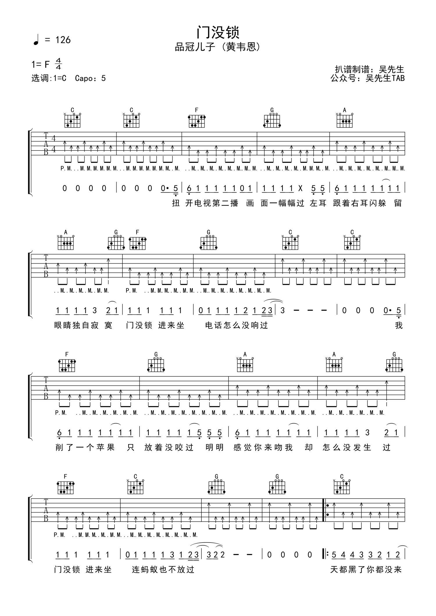 曲谱介绍: 品冠儿子 (黄韦恩)《门没锁》吉他谱_C调吉他弹唱谱