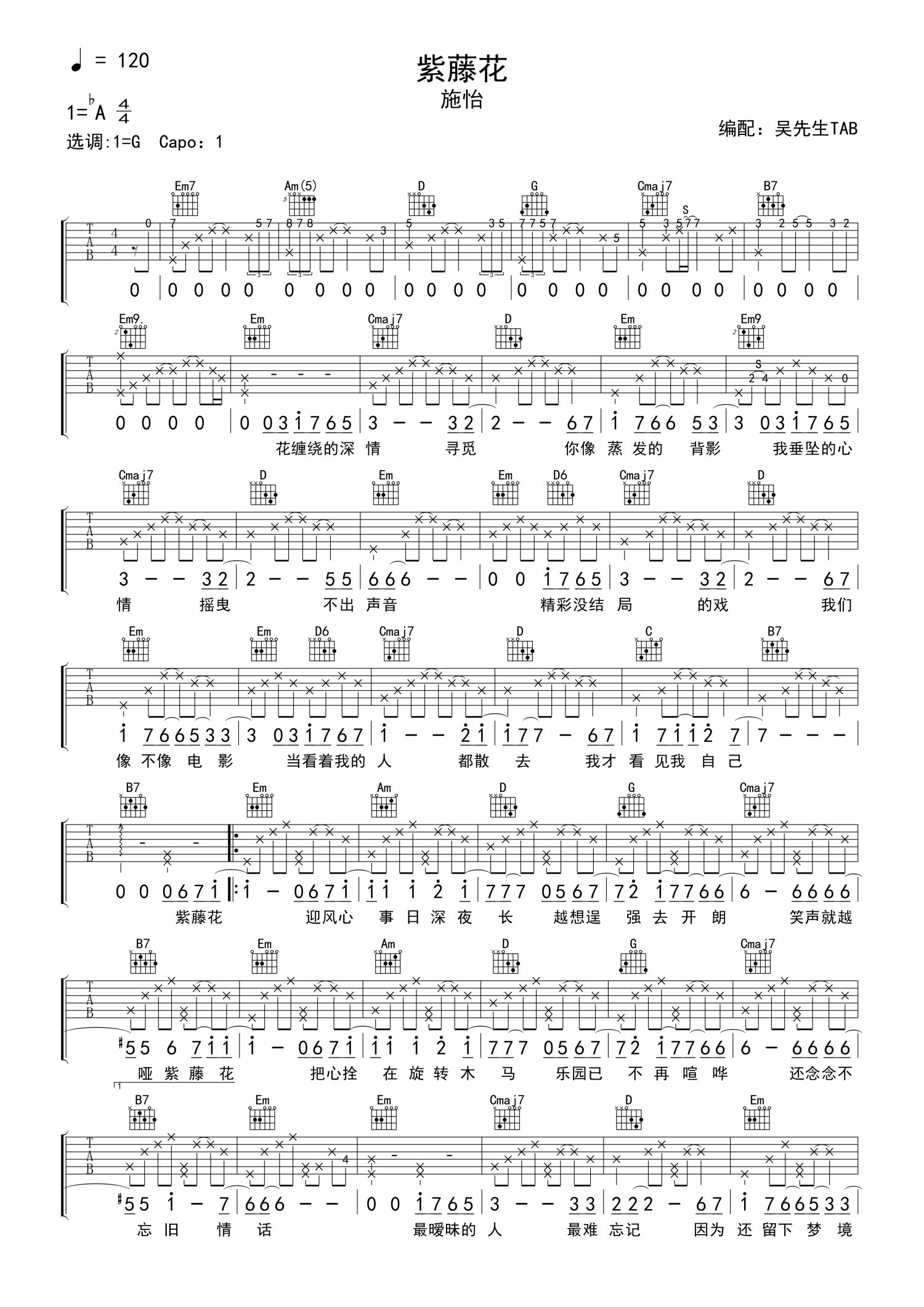 曲谱介绍: 施怡《紫藤花》吉他谱_G调吉他弹唱谱_双页免翻页版