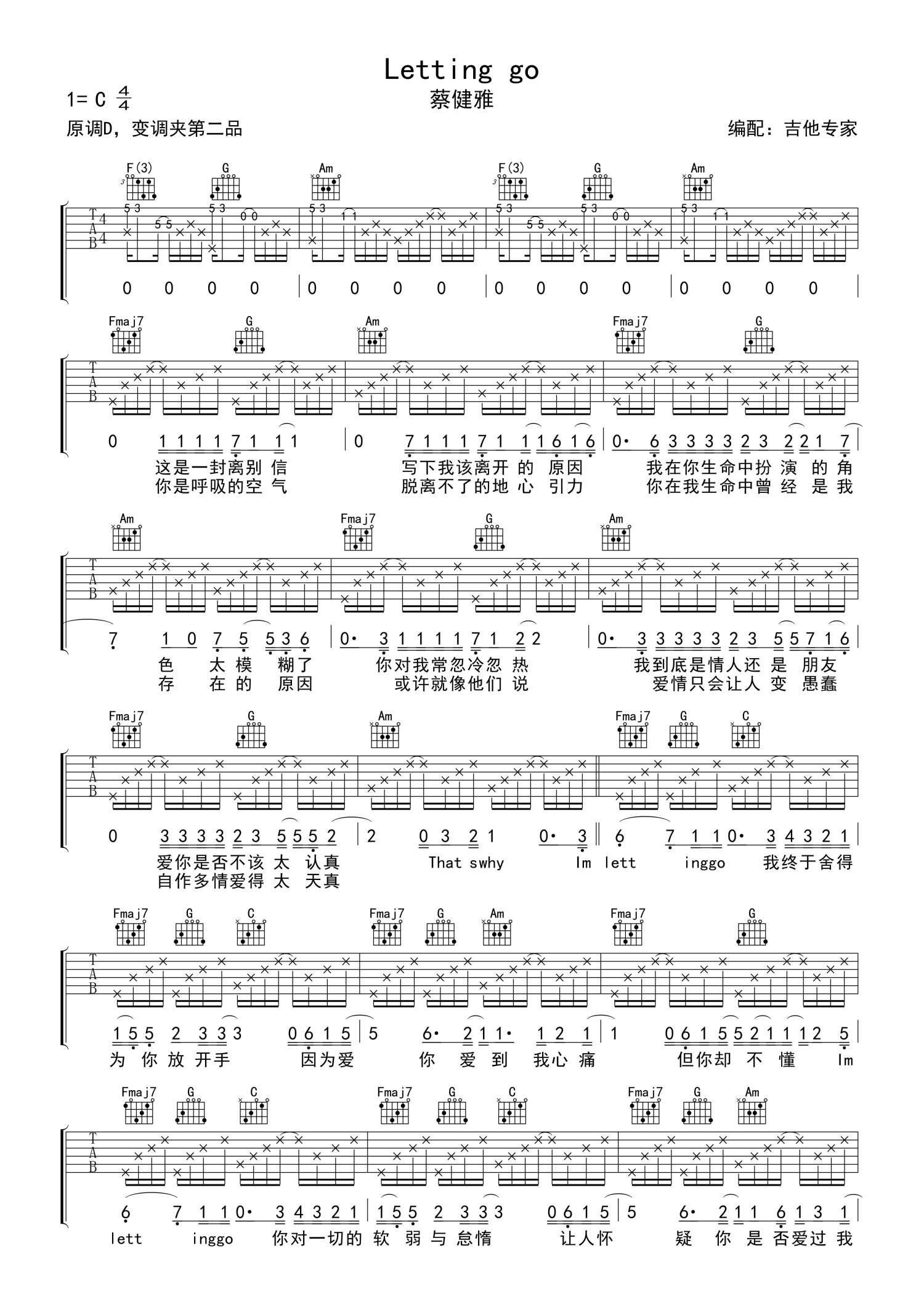 曲谱介绍: 蔡健雅《Letting go》吉他谱_C调吉他弹唱谱