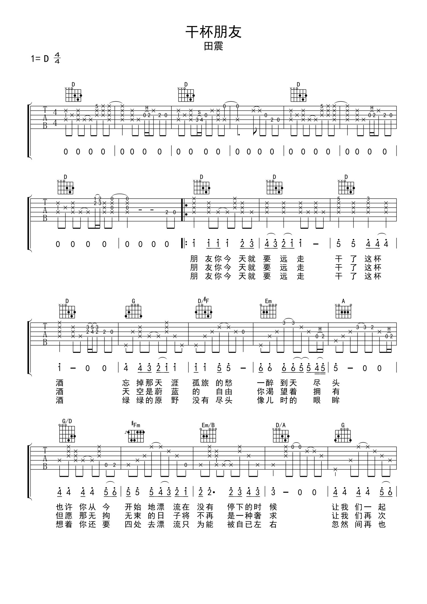 • 干杯朋友吉他谱 - 田震 - D调吉他弹唱谱第1张