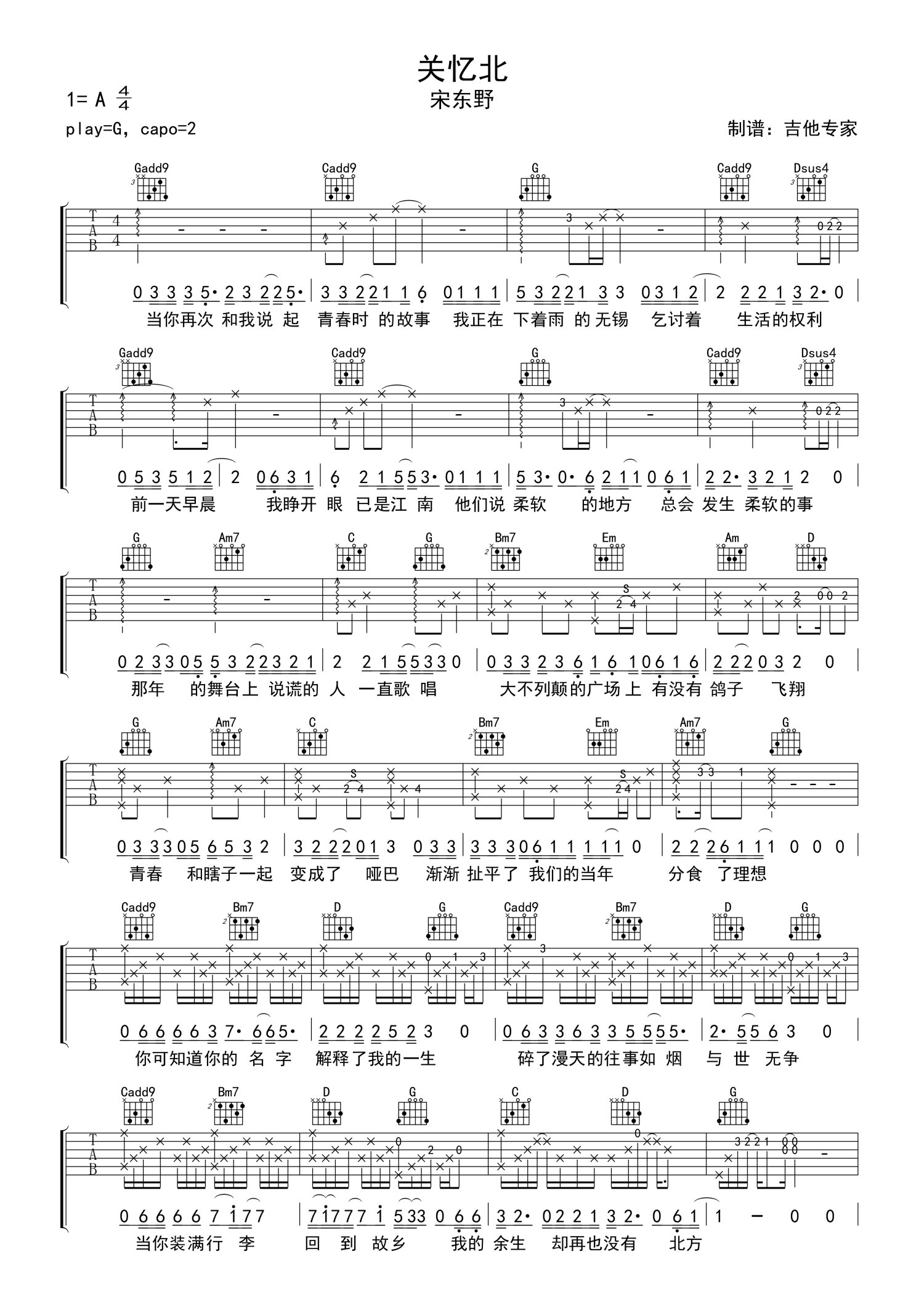 曲谱介绍: 宋冬野《关忆北》吉他谱_G调吉他弹唱谱