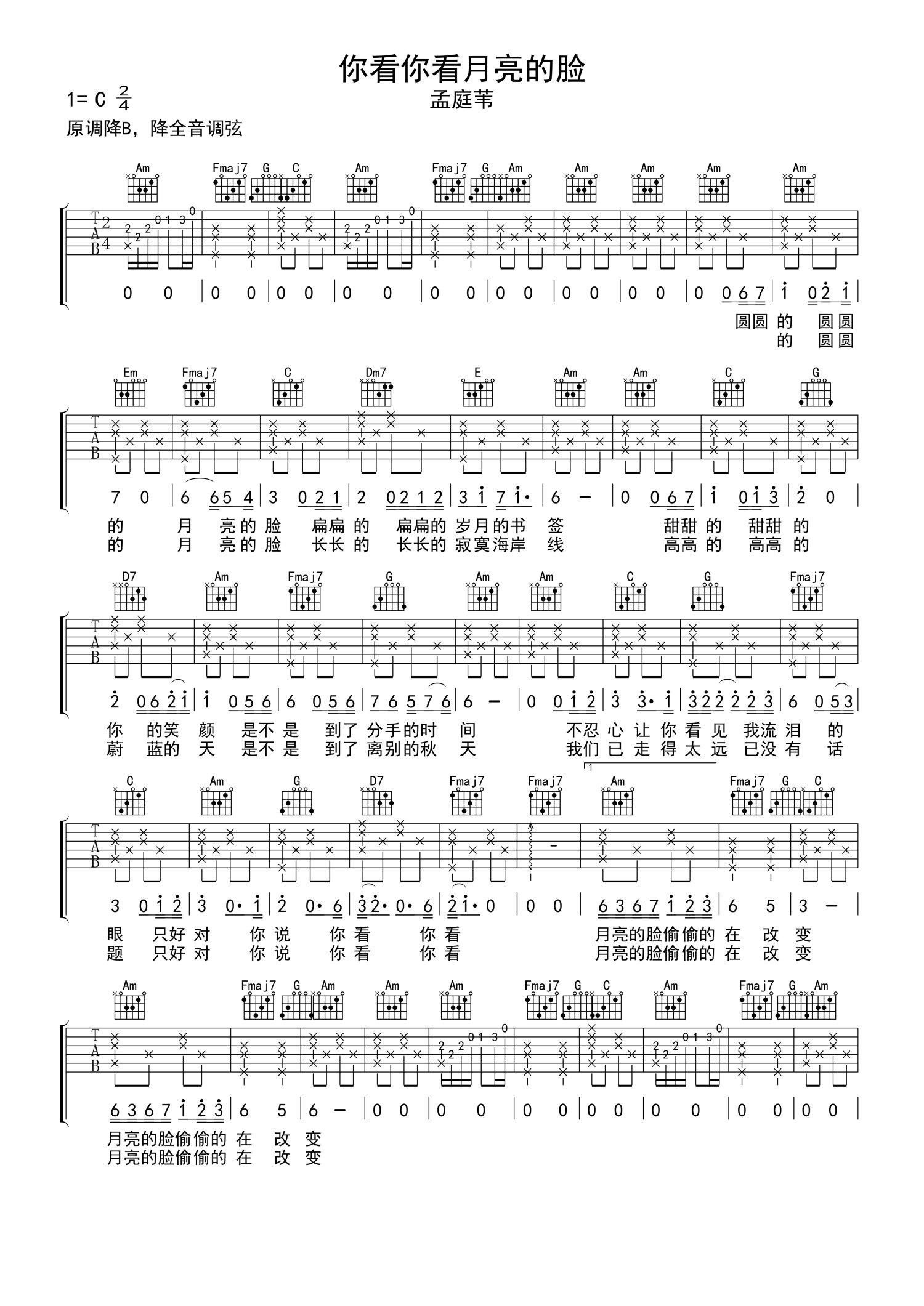 曲谱介绍: 孟庭苇《你看你看月亮的脸》吉他谱_C调吉他弹唱谱