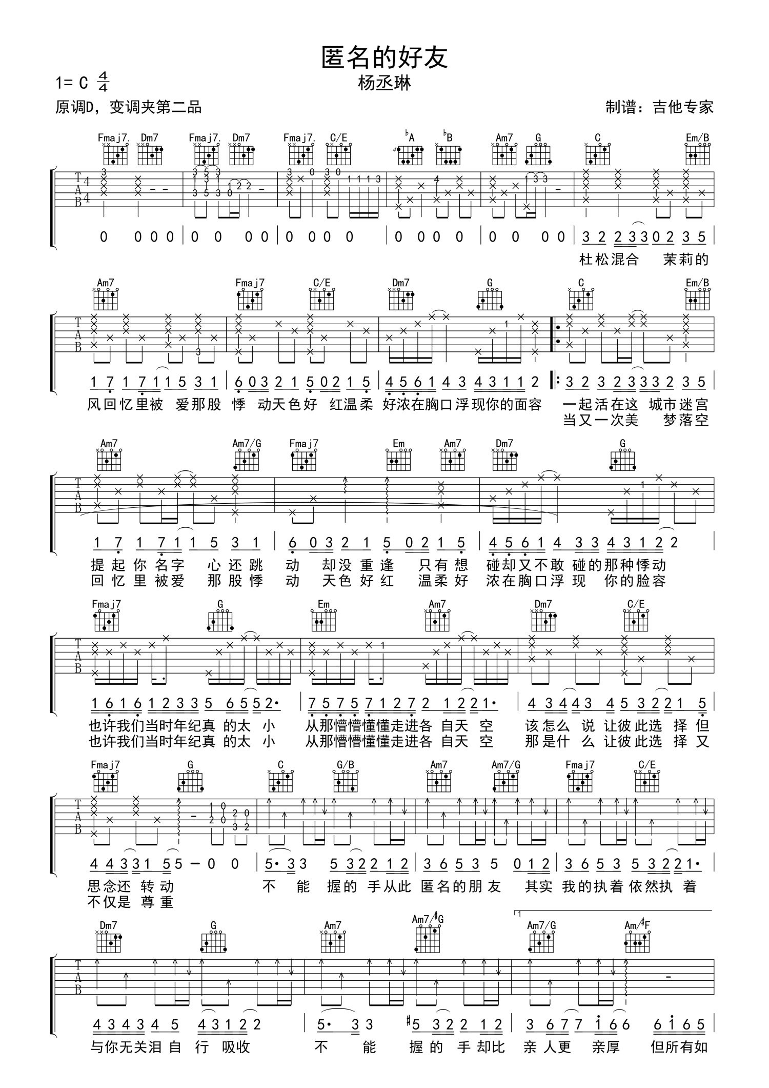 • 匿名的好友吉他谱 - 杨丞琳 - C调吉他弹唱谱第1张
