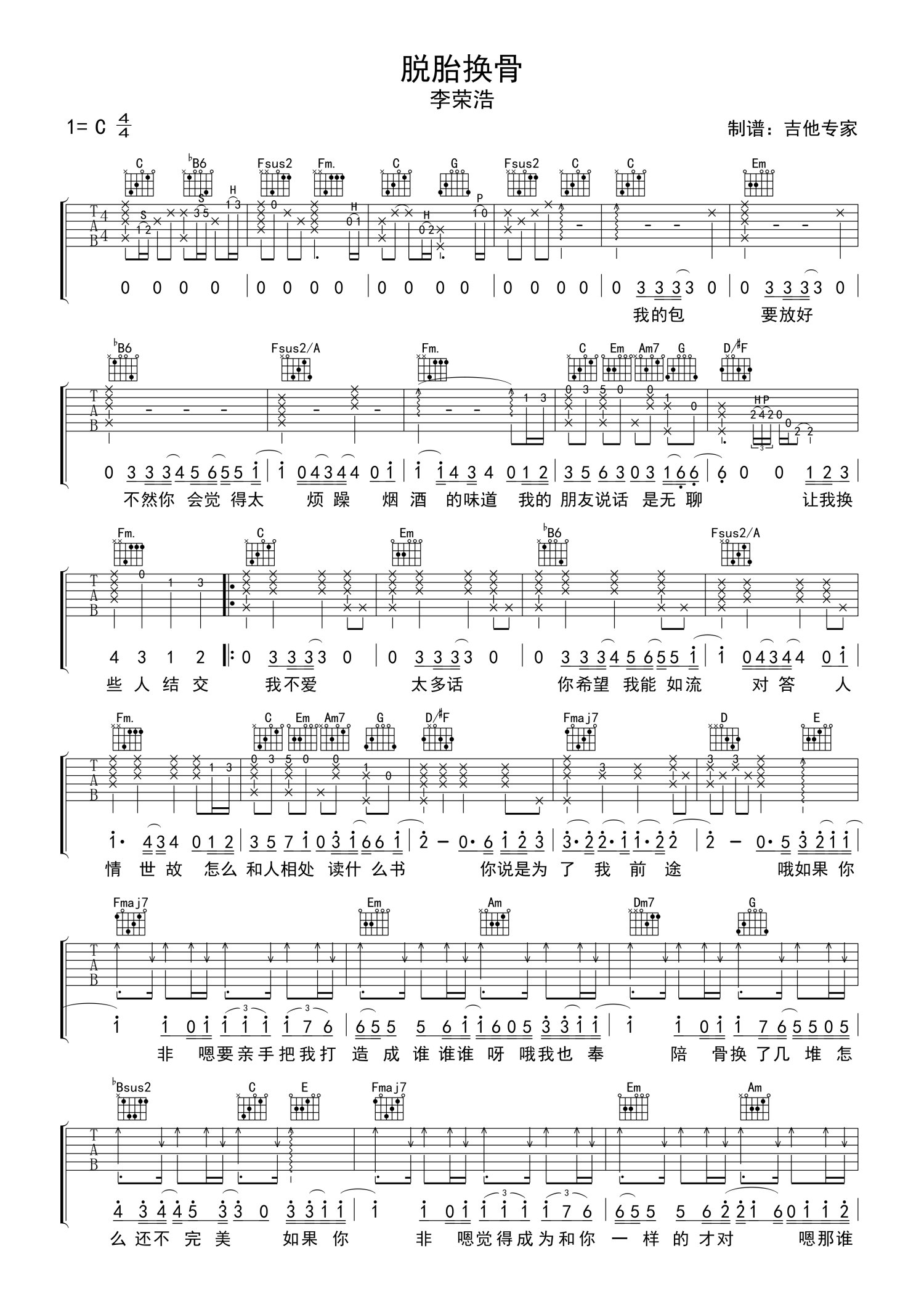 曲谱介绍: 李荣浩《脱胎换骨》吉他谱_C调吉他弹唱谱