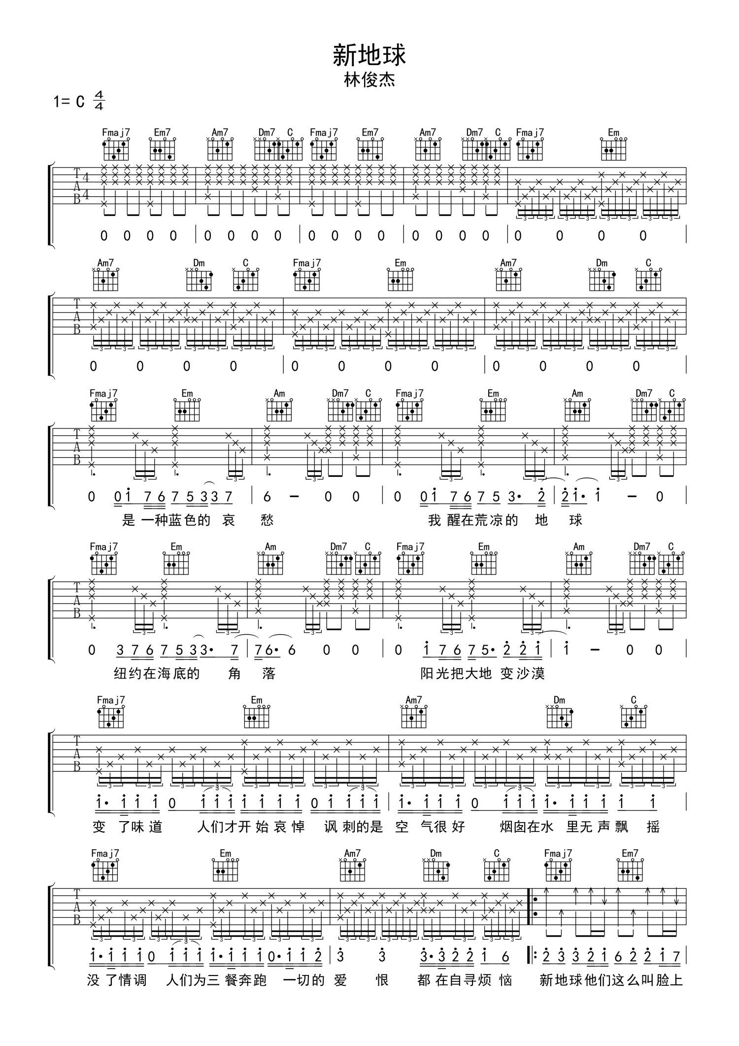 曲谱介绍: 林俊杰《新地球》吉他谱_C调吉他弹唱谱