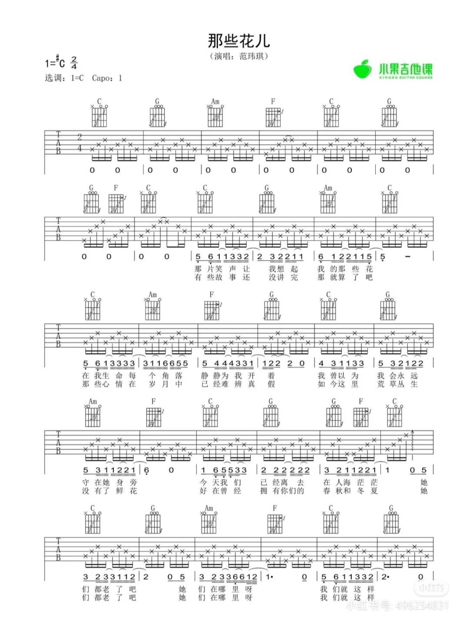 曲谱介绍: 范玮琪《那些花儿》吉他谱_C调吉他弹唱谱