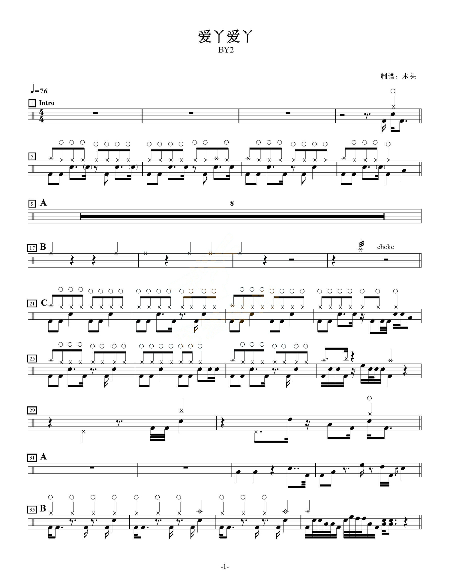 曲谱介绍: BY2《爱丫爱丫》鼓谱_架子鼓谱