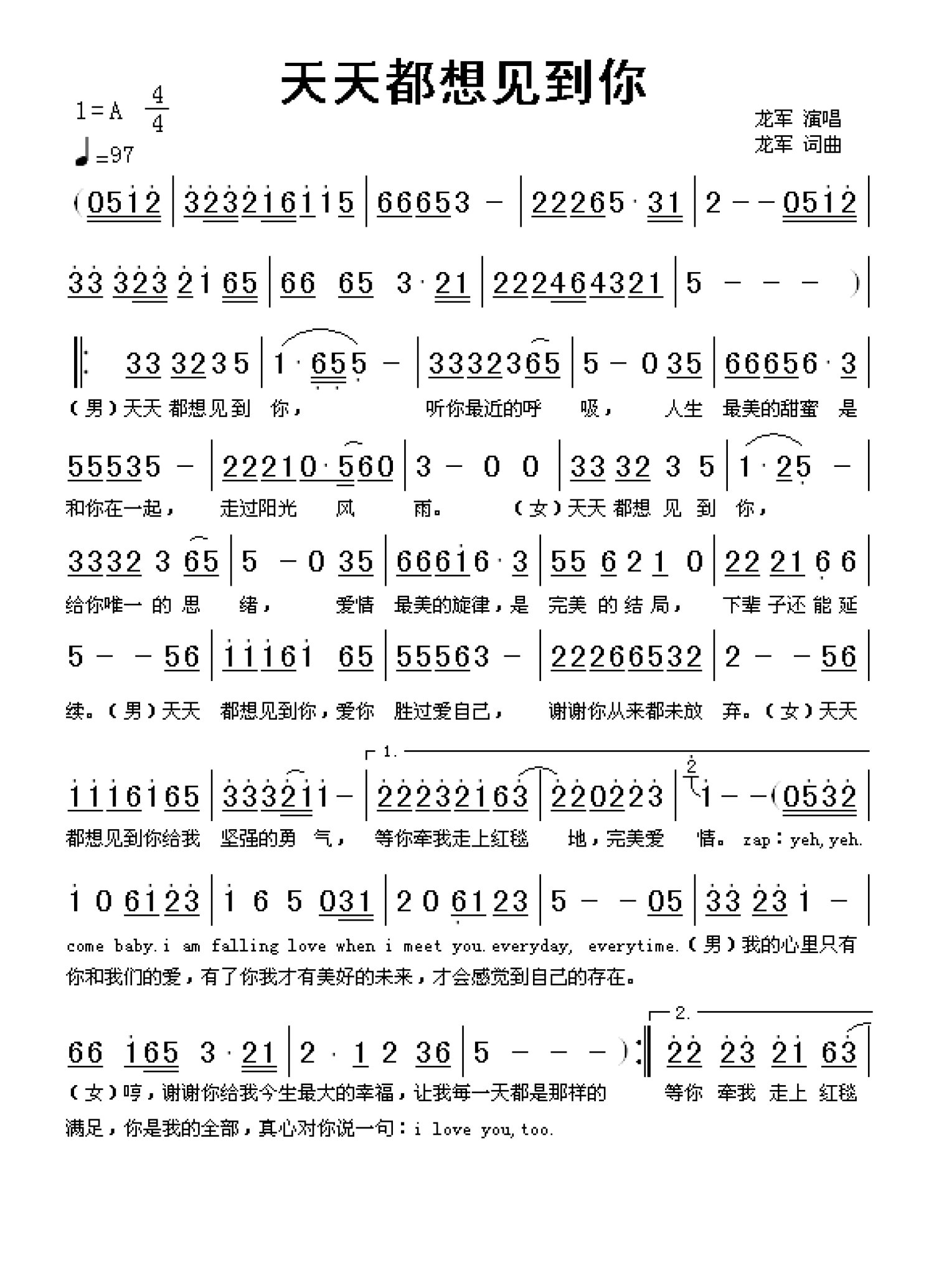 曲谱介绍: 龙军《天天都想见到你》歌词_简谱