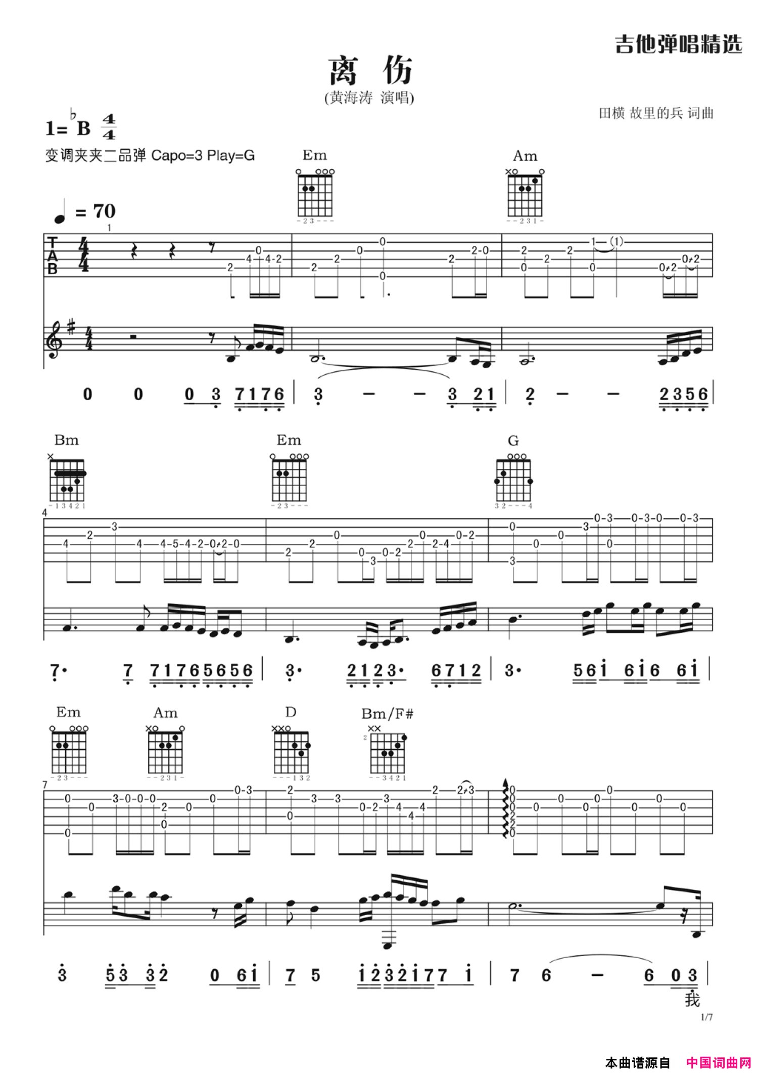 曲谱介绍: 黄海涛《离伤》吉他谱_G调吉他弹唱谱