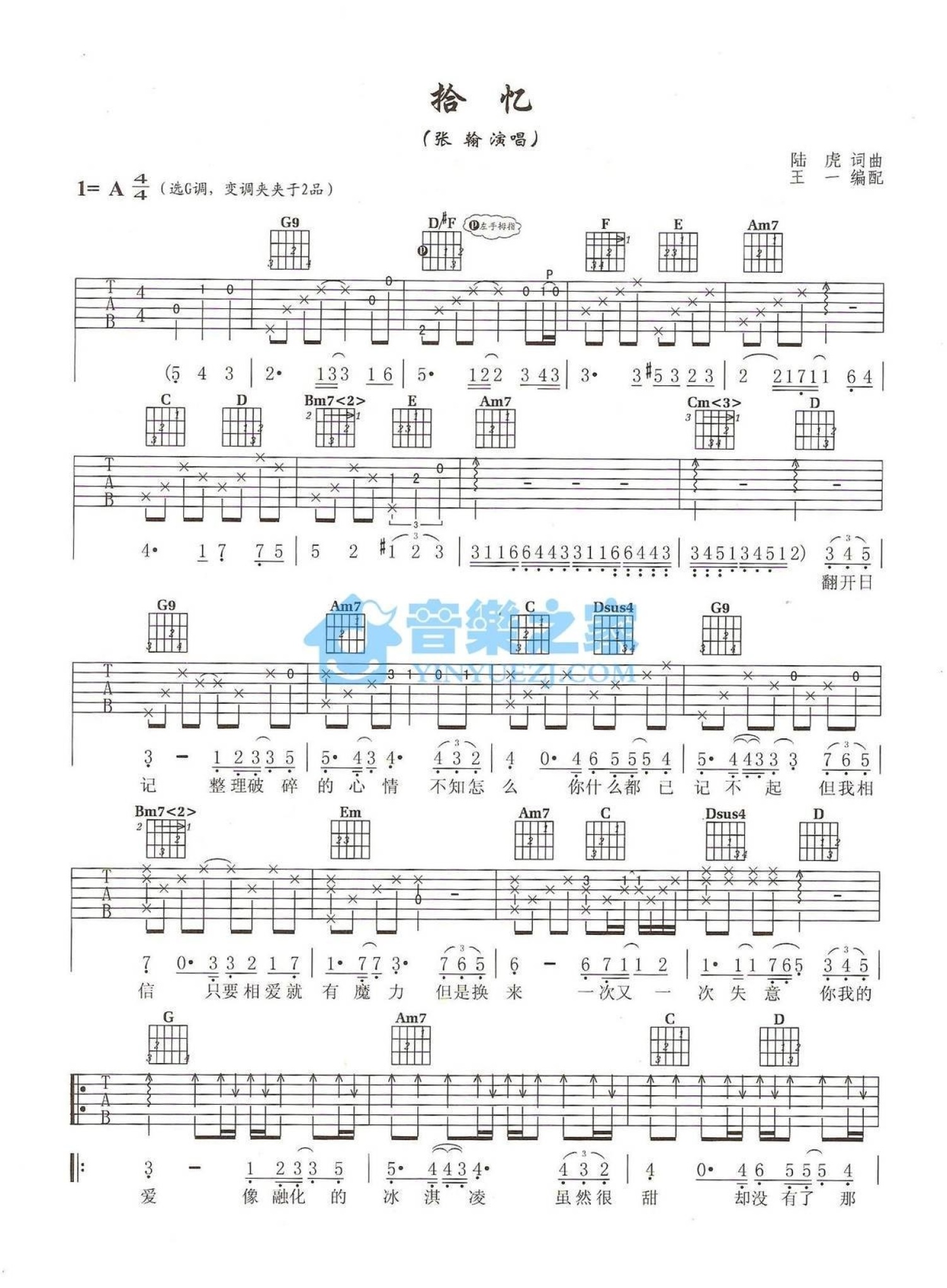 曲谱介绍: G调版 张翰《拾忆》吉他弹唱六线谱