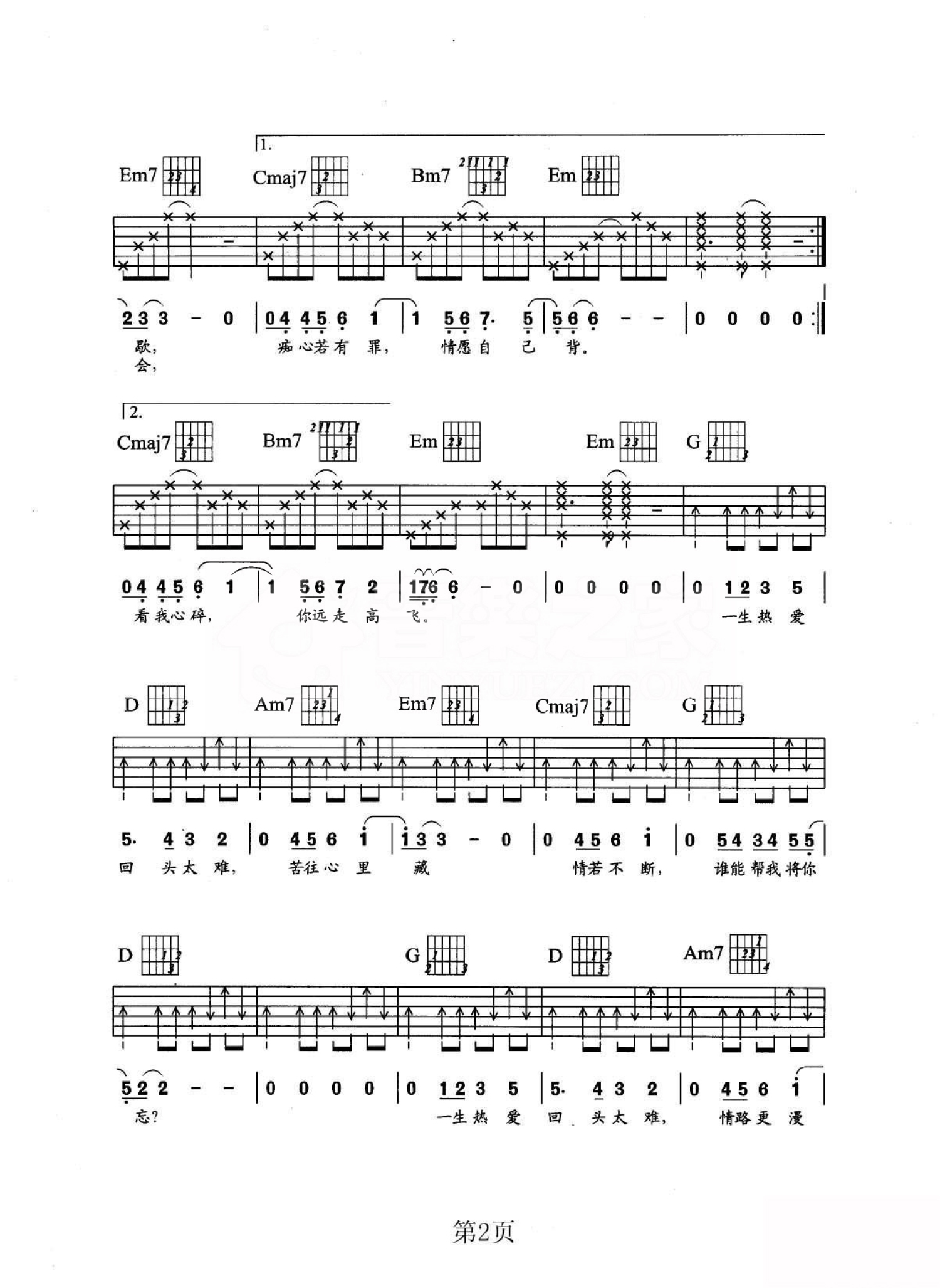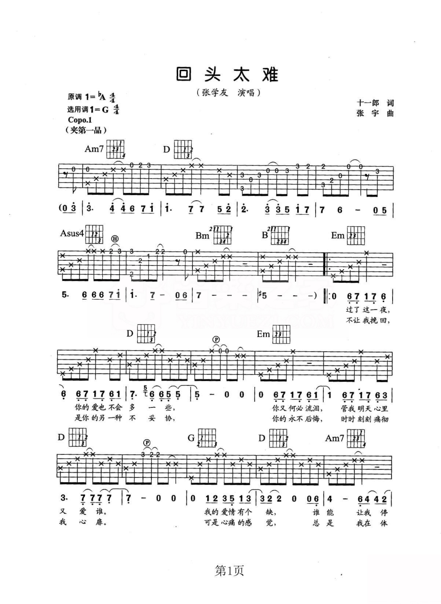 曲谱介绍: 张学友《回头太难》吉他谱_G调吉他弹唱谱