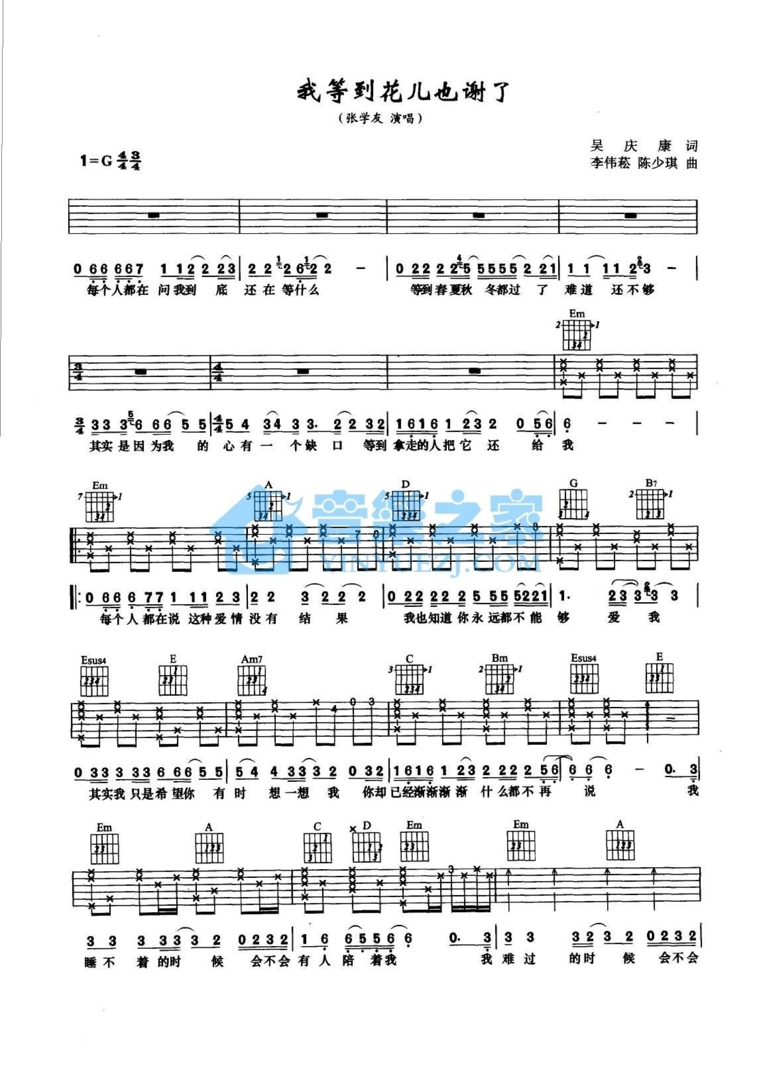 曲谱介绍: 张学友《我等到花儿也谢了》吉他谱_G调吉他弹唱谱_双吉他版