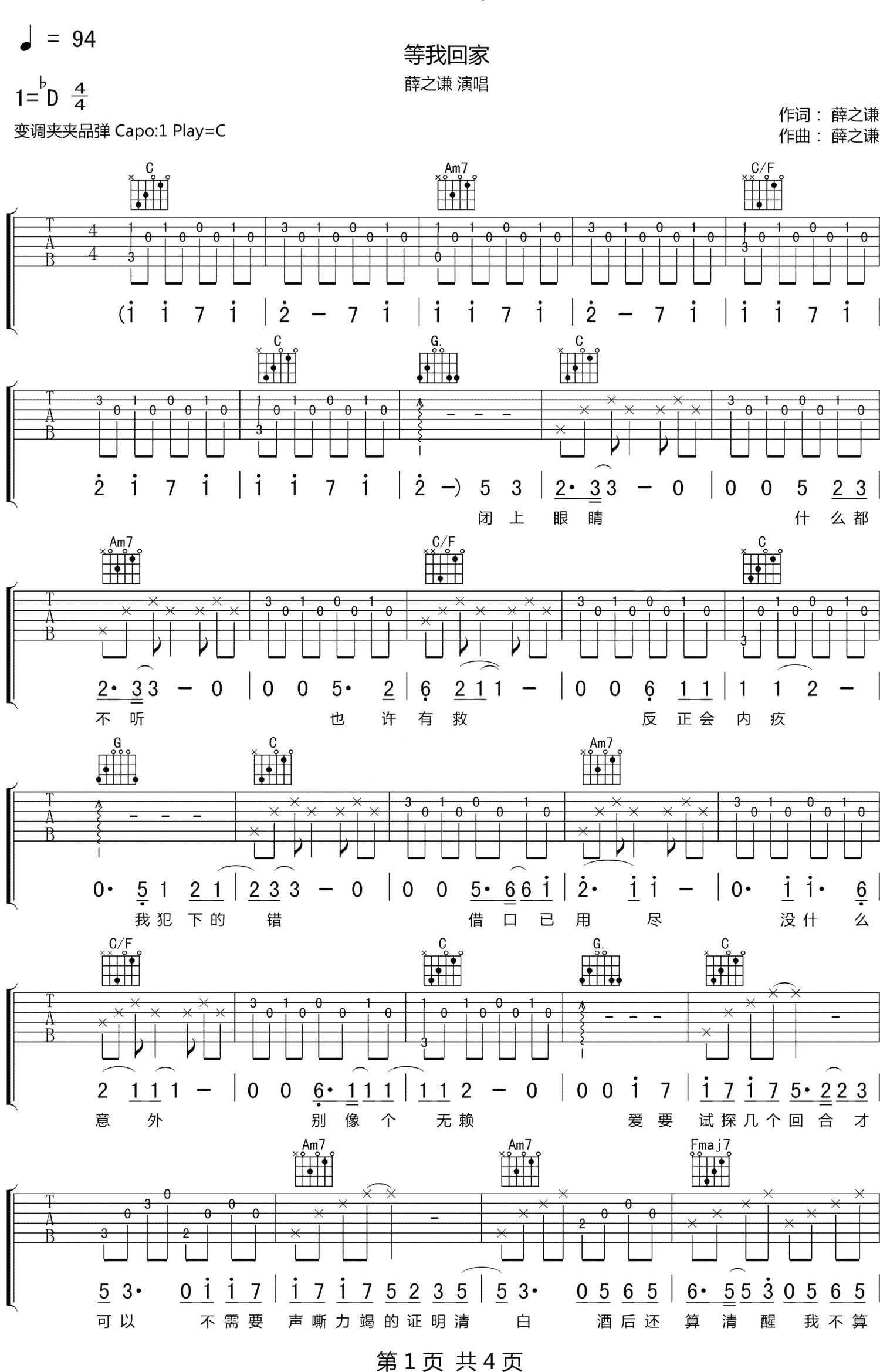 等我回家吉他谱 - 薛之谦 - C调吉他弹唱谱