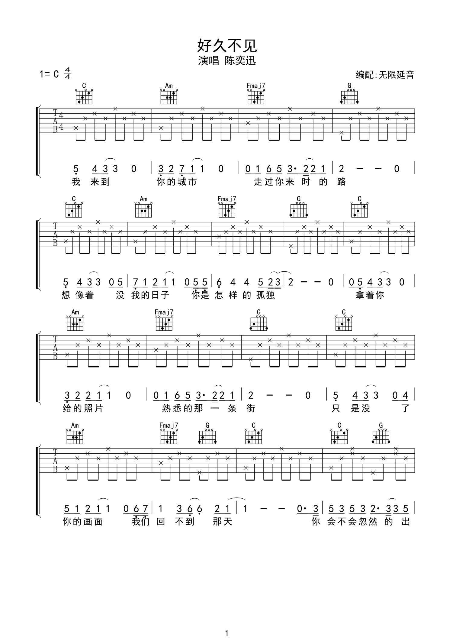 曲谱介绍: 陈奕迅《好久不见》吉他弹唱谱,共有2张高清图谱,免翻页排版设计。