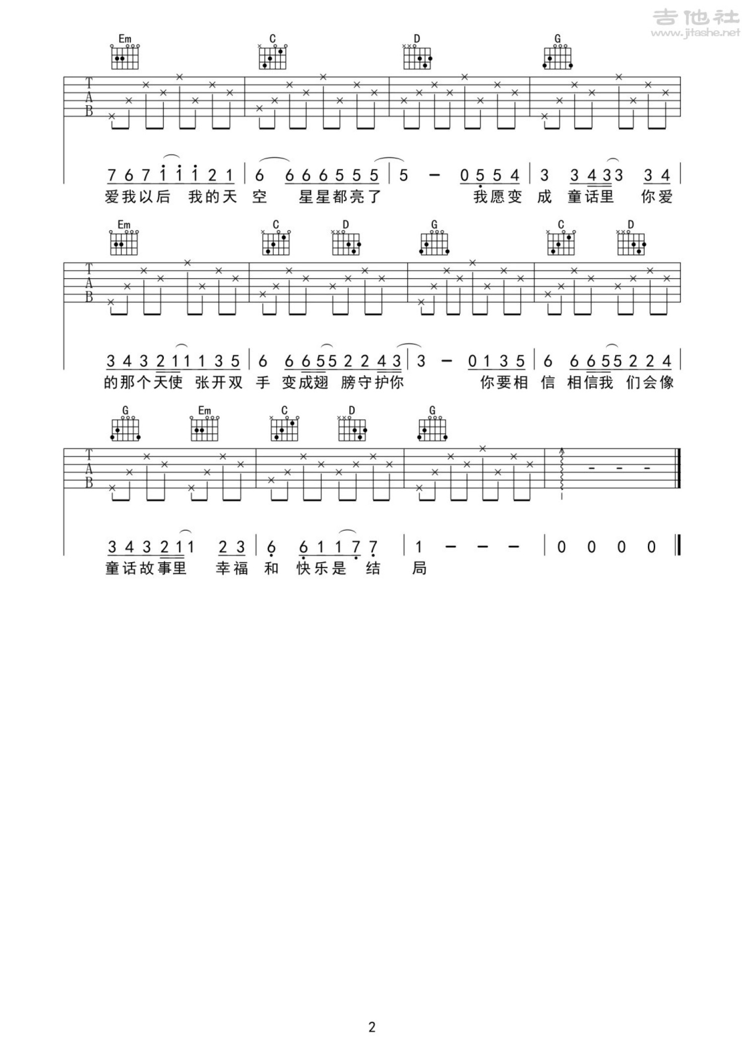 曲谱介绍: 光良《童话》吉他弹唱谱,共有2张高清图谱,免翻页排版设计。