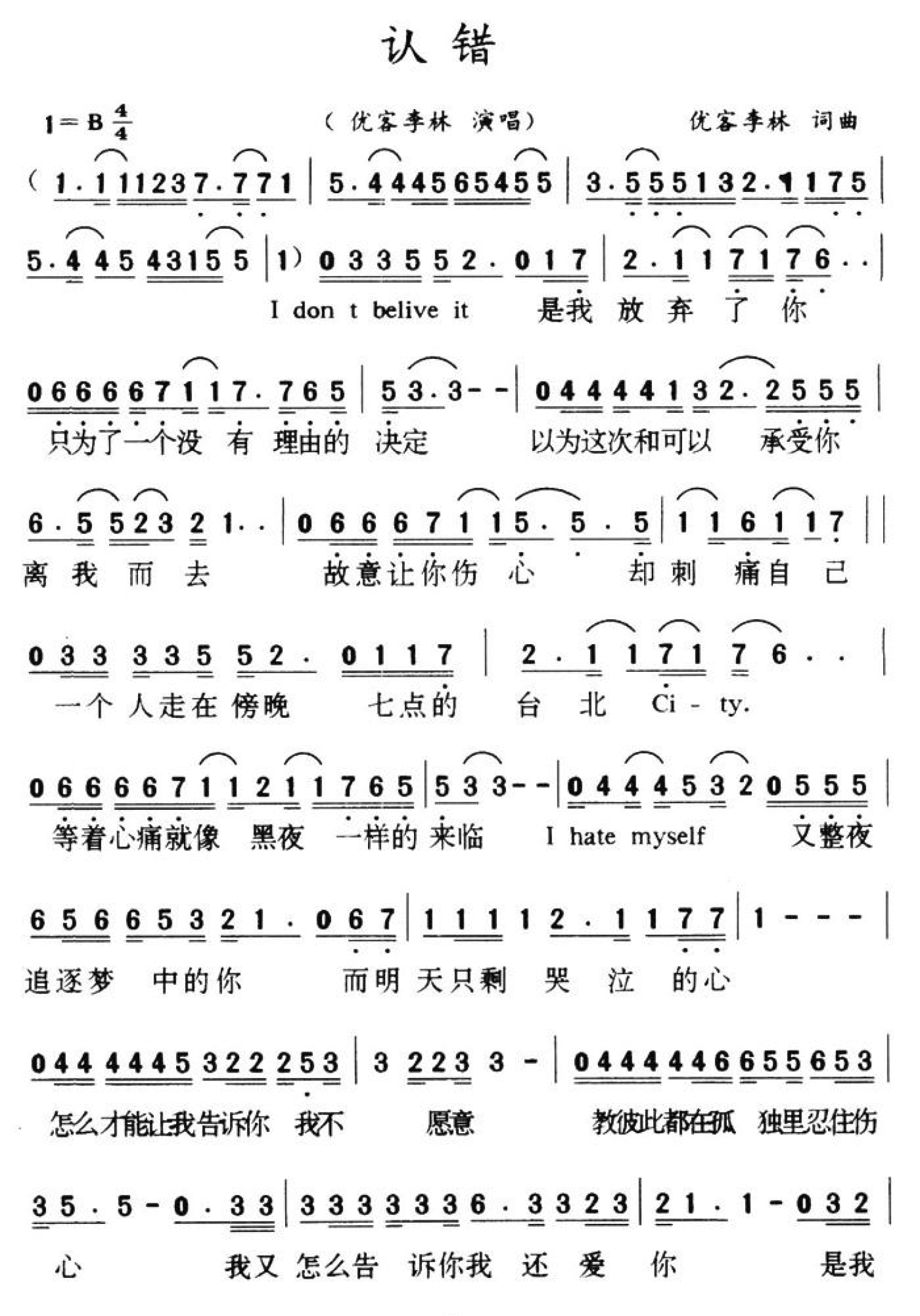 曲谱介绍: 优客李林《认错》简谱,共有2张高清图谱,免翻页排版设计。