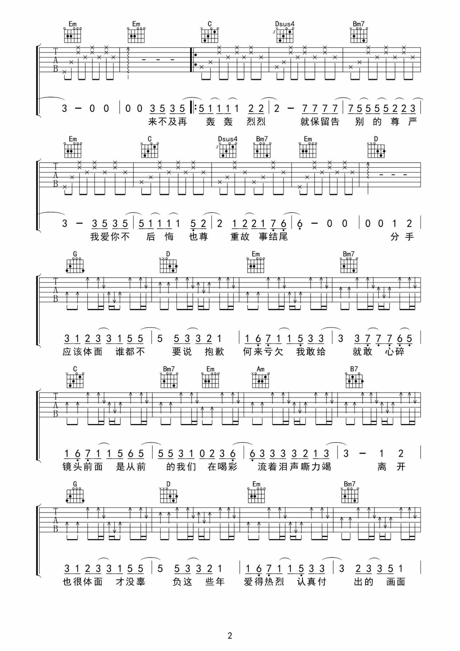 曲谱介绍: 再见,不负遇见。歌曲以钢琴为基调,旋律舒缓低沉,歌词字里行间徐徐诉说着主人公们热烈爱过却不得不选择分手的不舍与无奈,“分手应该体面,谁都不要说抱歉”更是流露出影片中男女主人公爱过不后悔,体面分手的内心独白。原调降B调,这里采用C调指法,简单版方便大家的弹唱,建议变调夹夹第三品。