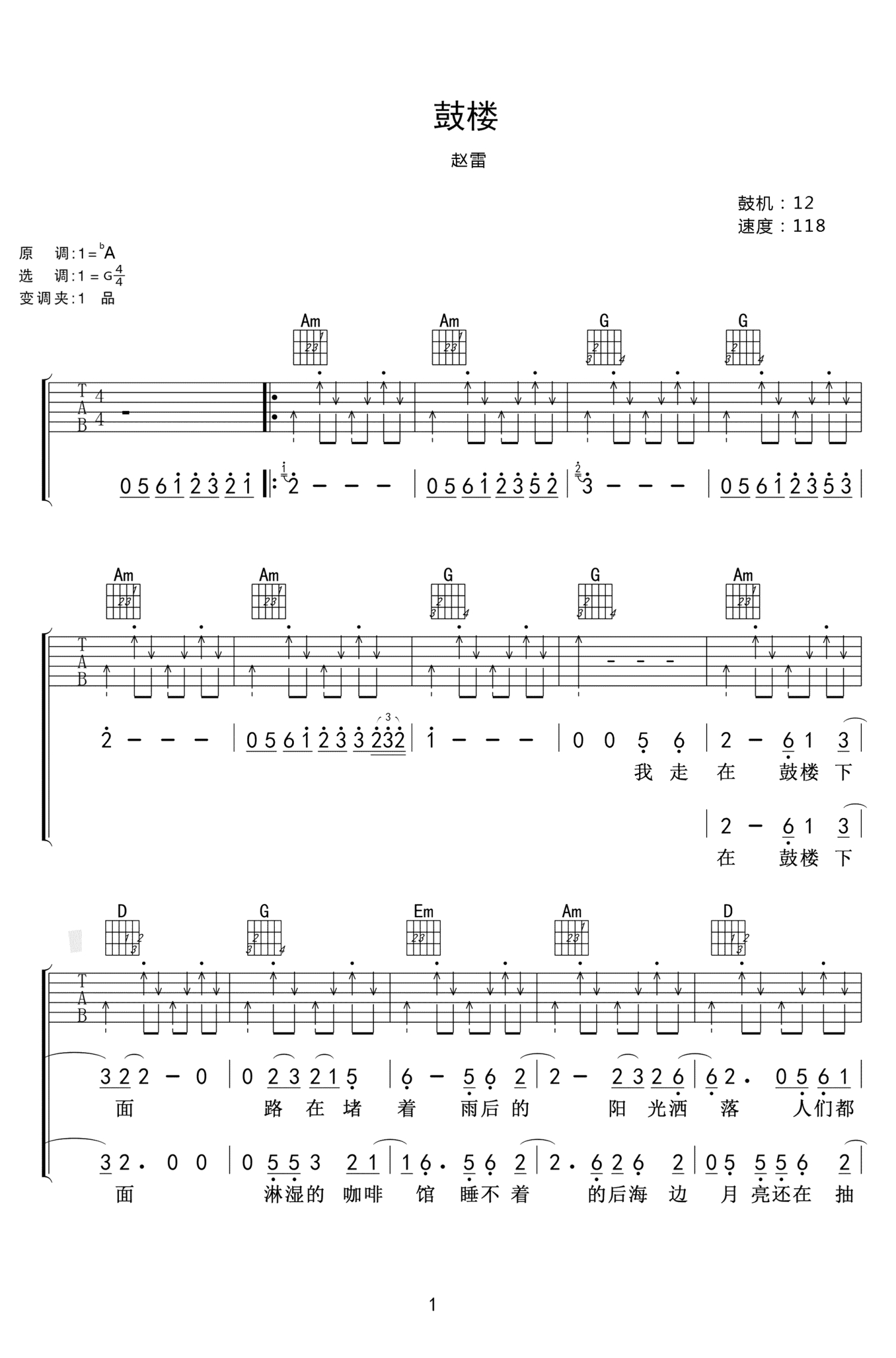 曲谱介绍: 赵雷《鼓楼》吉他谱,G调指法弹唱谱,变调夹夹一品,都市楼层愈高,女人妆容愈厚,人们心里愈空。十字街头听见熟悉的节奏,或许,对于我们这些过客,这份单薄的存在感不过如此。站在站在鼓楼上面,一切繁华与我无关。