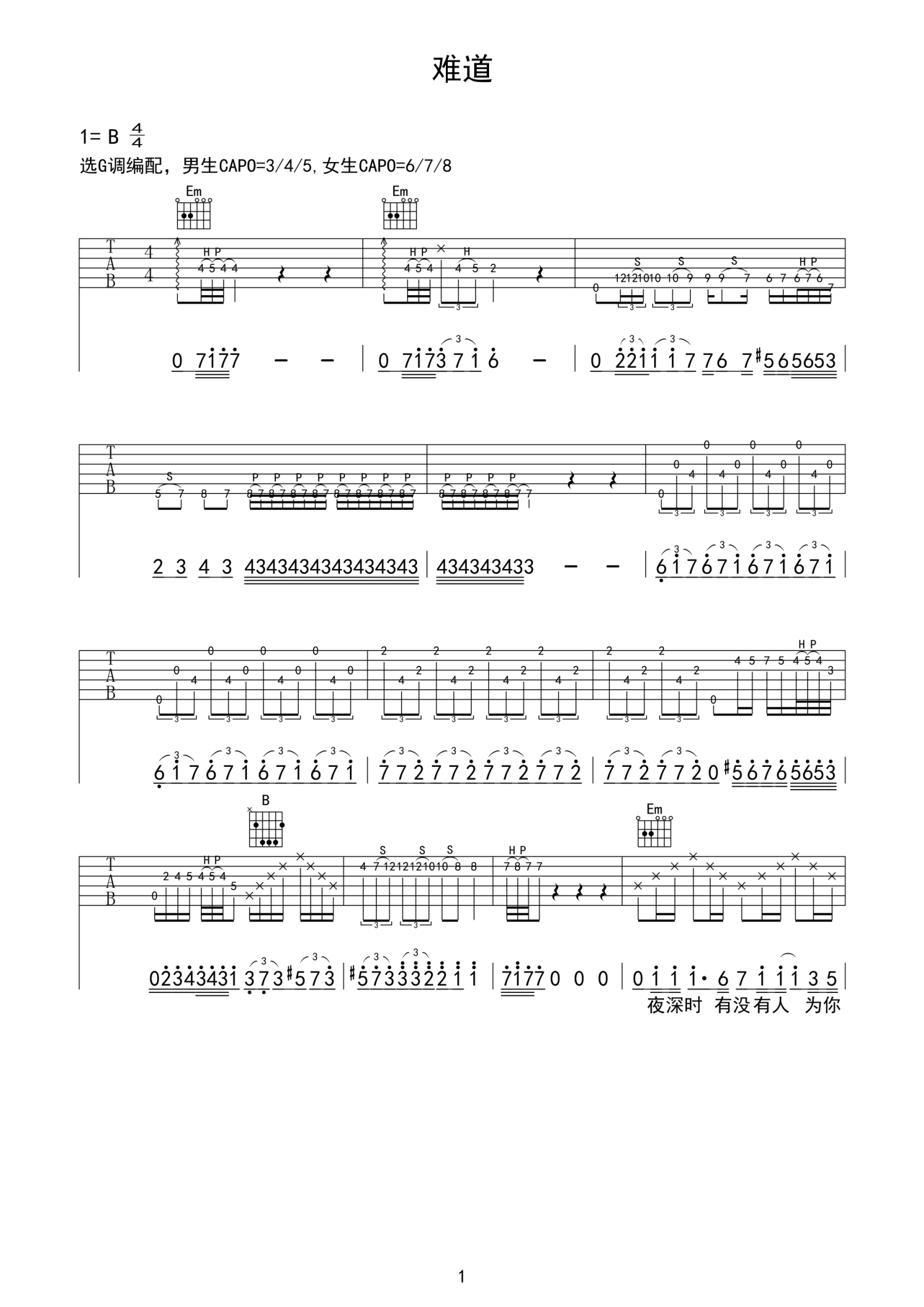 曲谱介绍: 羽泉的难道吉他谱,原调B,选调G,变调夹可以根据琴友们各自的音域调整。喜欢的朋友们可右键另存为下载打印收藏。《难道》是陈羽凡的一首经典歌曲,是最适合吉他弹唱的曲目。