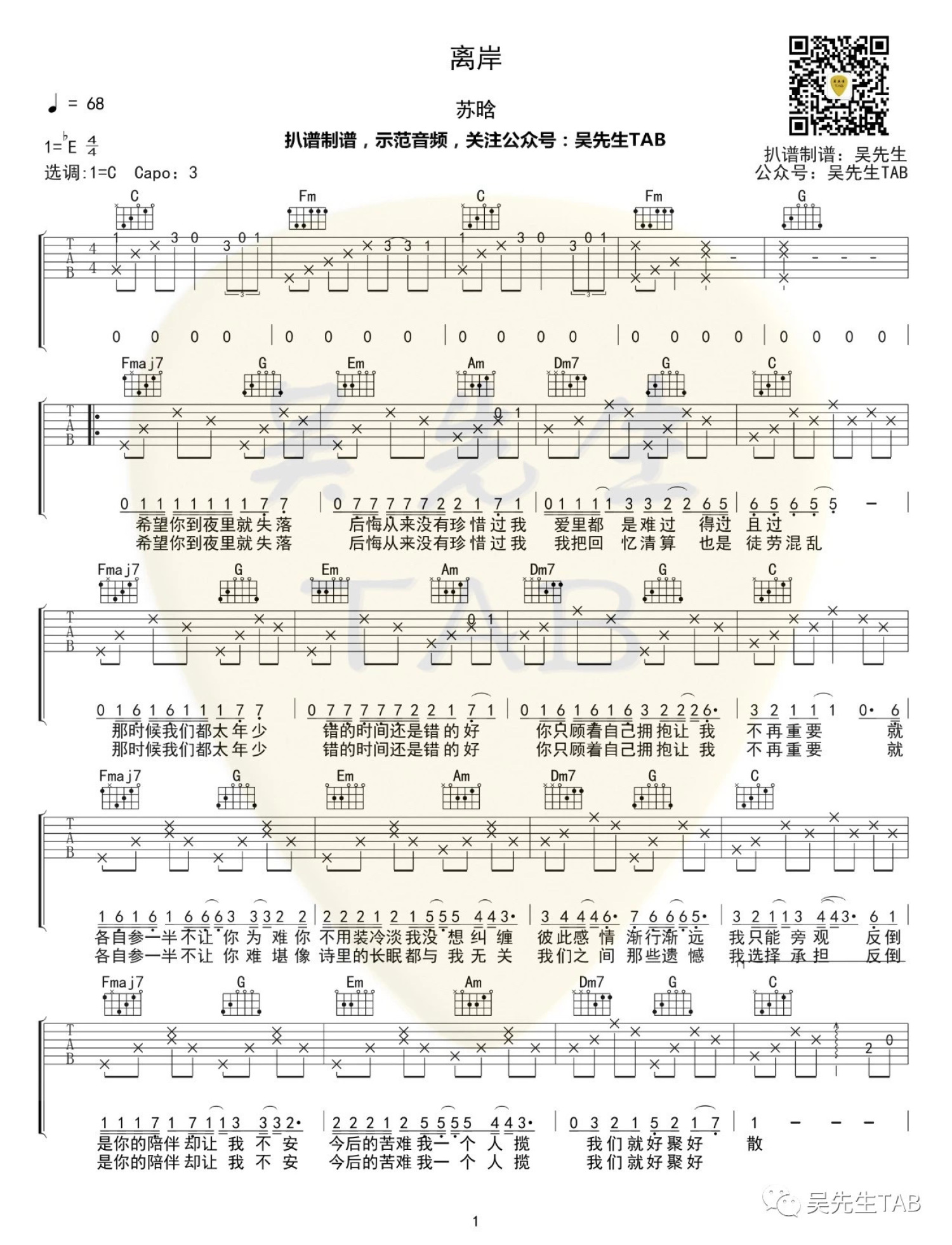 曲谱介绍: 薛之谦《离岸》吉他弹唱谱,共有2张高清图谱,免翻页排版设计。