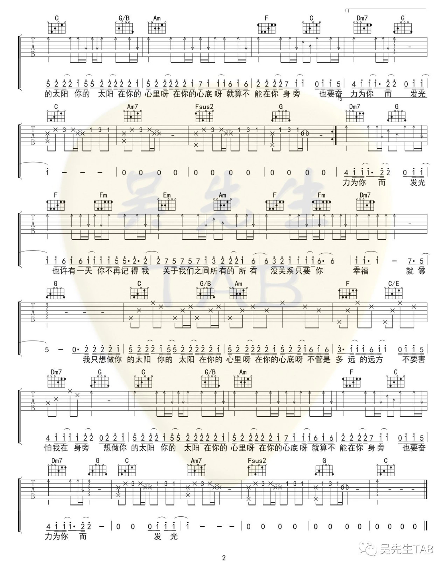 曲谱介绍: 薛之谦《太阳》吉他弹唱谱,共有2张高清图谱,免翻页排版设计。