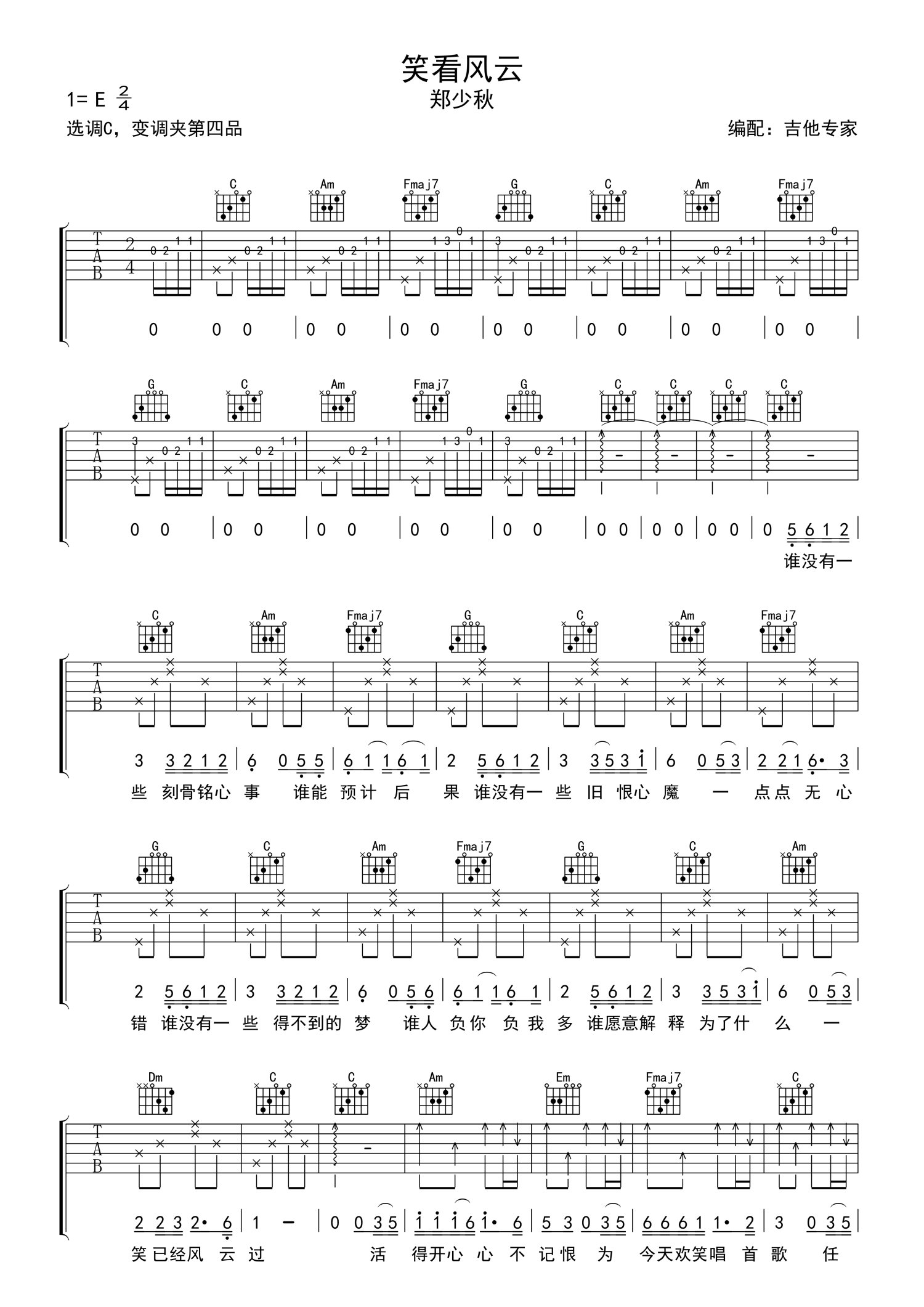 曲谱介绍: 郑少秋《笑看风云》吉他弹唱谱,采用C调指法编配,吉他专家编配出品,共有2张高清图谱,免翻页排版设计。