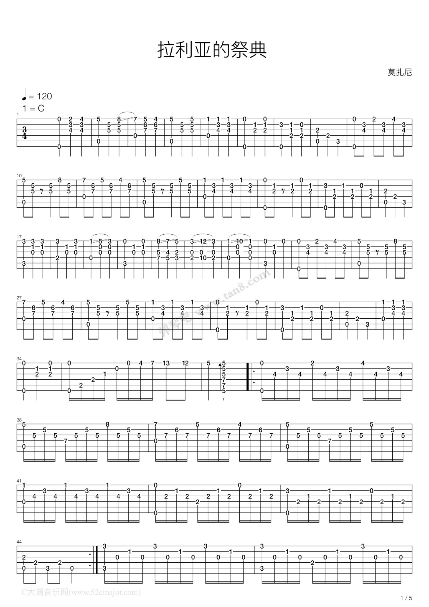 曲谱介绍: 莫扎尼《拉利亚祭奠》吉他弹唱谱,共有5张高清图谱。