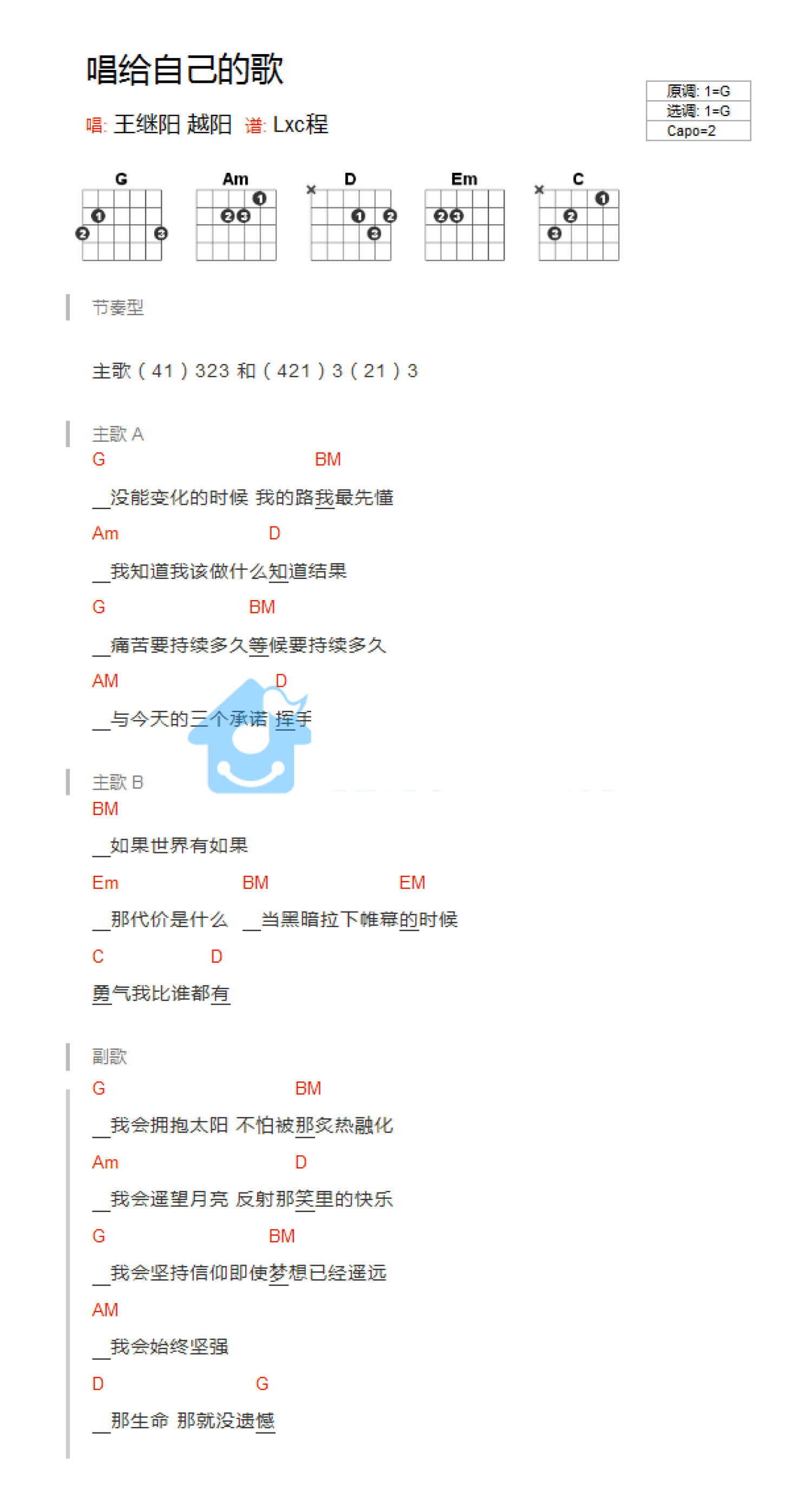 曲谱介绍: G调版 王继阳/越阳《唱给自己的歌》吉他和弦弹唱谱