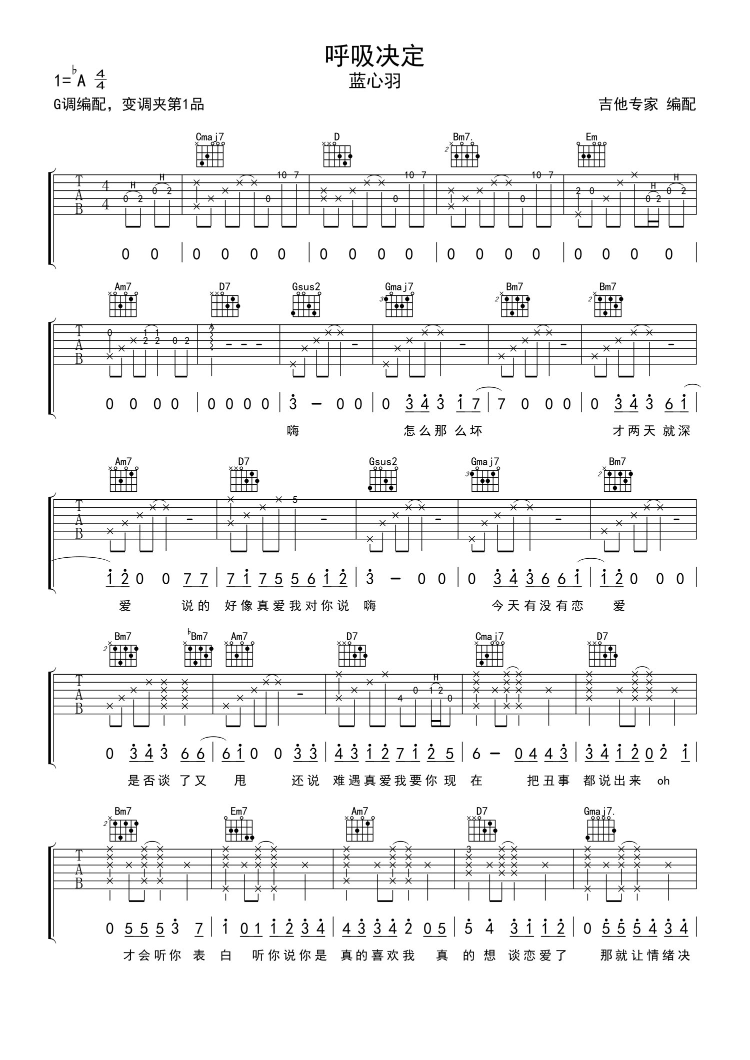 曲谱介绍: 蓝心羽《呼吸决定》吉他弹唱谱,采用G调指法编配,吉他专家编配出品,共有2张高清图谱,免翻页排版设计。