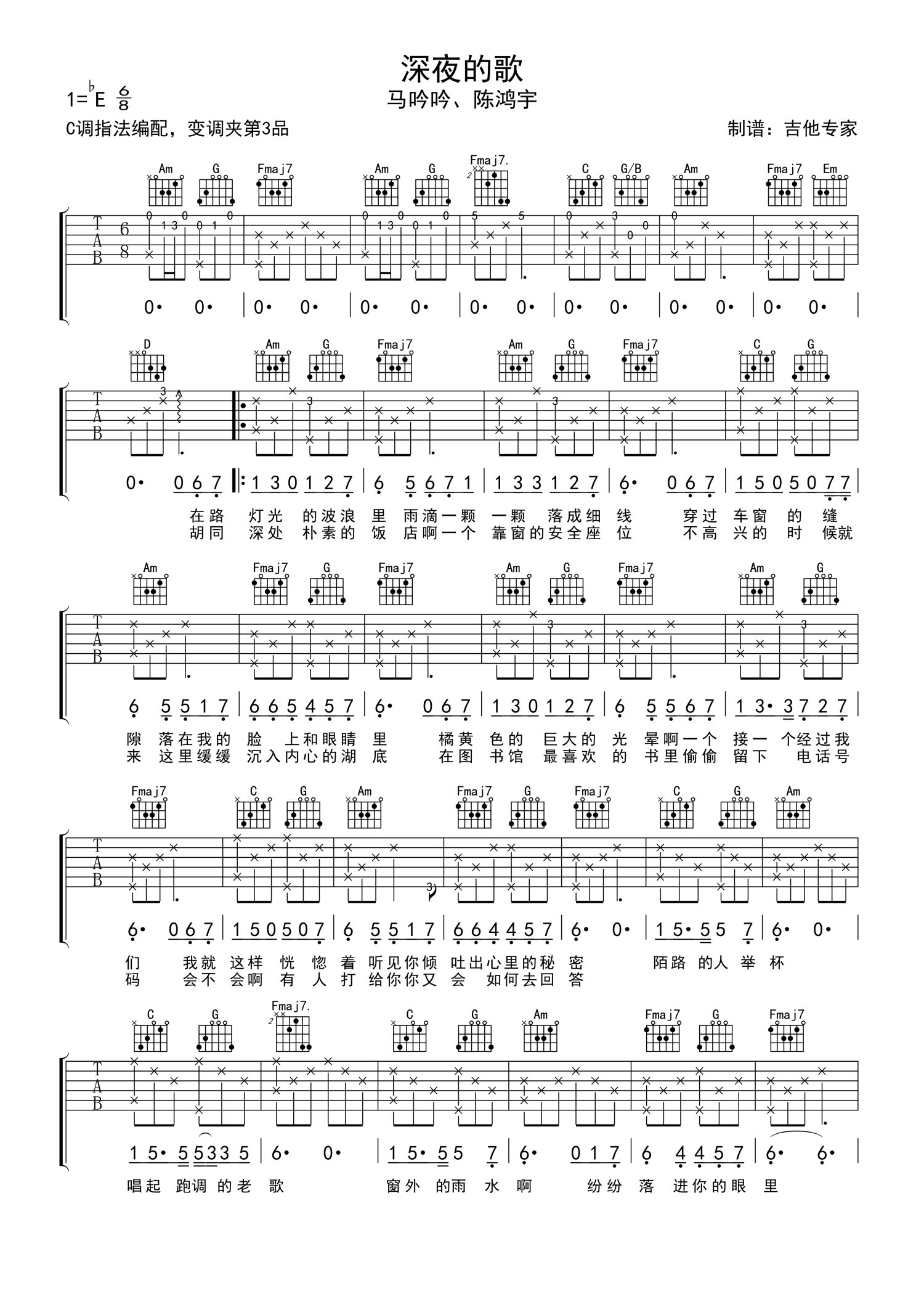 • 深夜的歌吉他谱 - 马吟吟/陈鸿宇 - C调吉他弹唱谱第1张