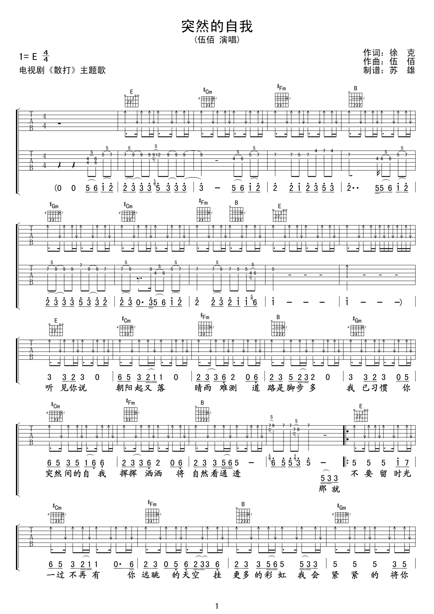 突然的自我吉他谱 - 伍佰 - E调吉他弹唱谱 - 双吉他版本