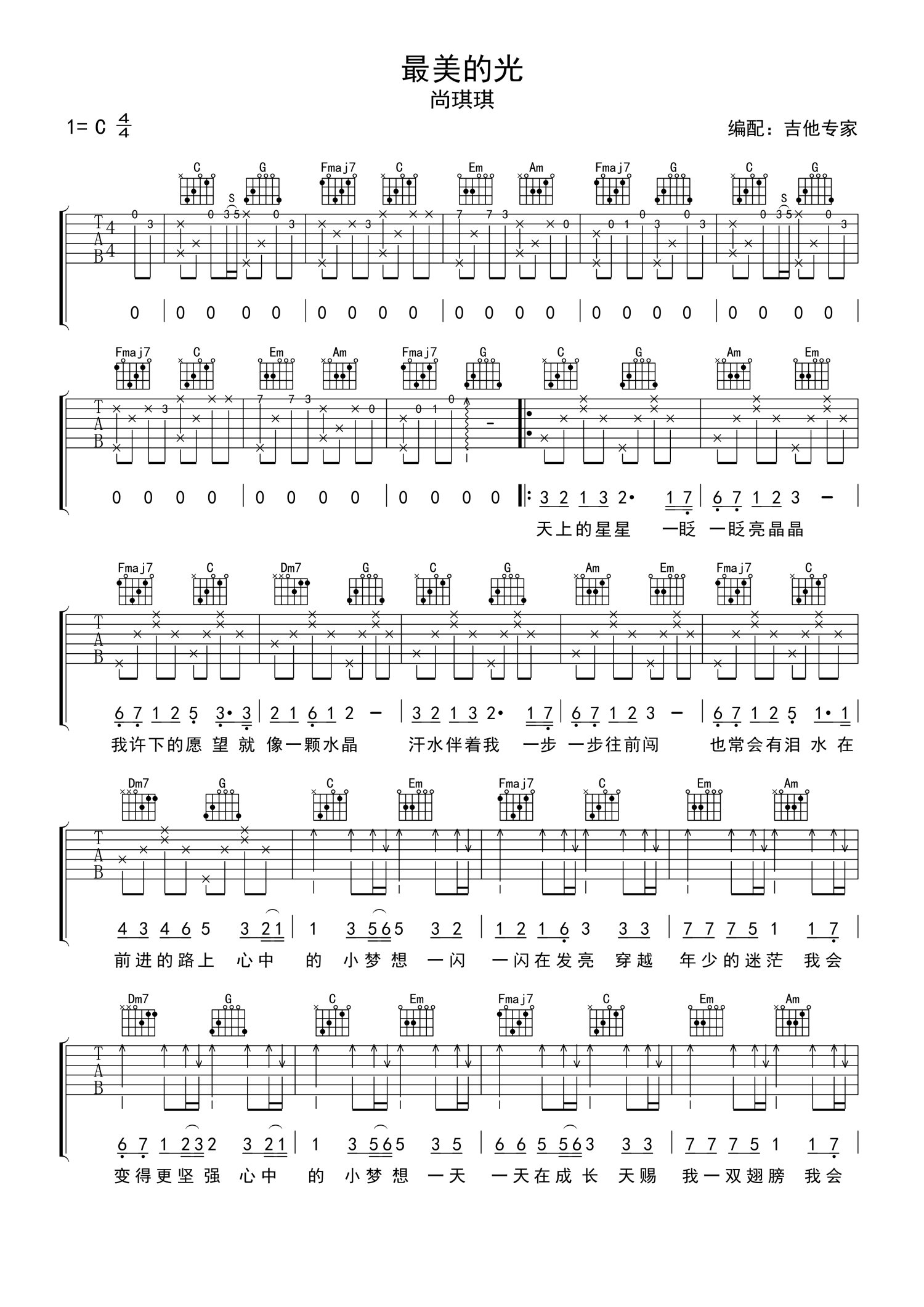• 最美的光吉他谱 - 尚琪琪 - C调吉他弹唱谱第1张