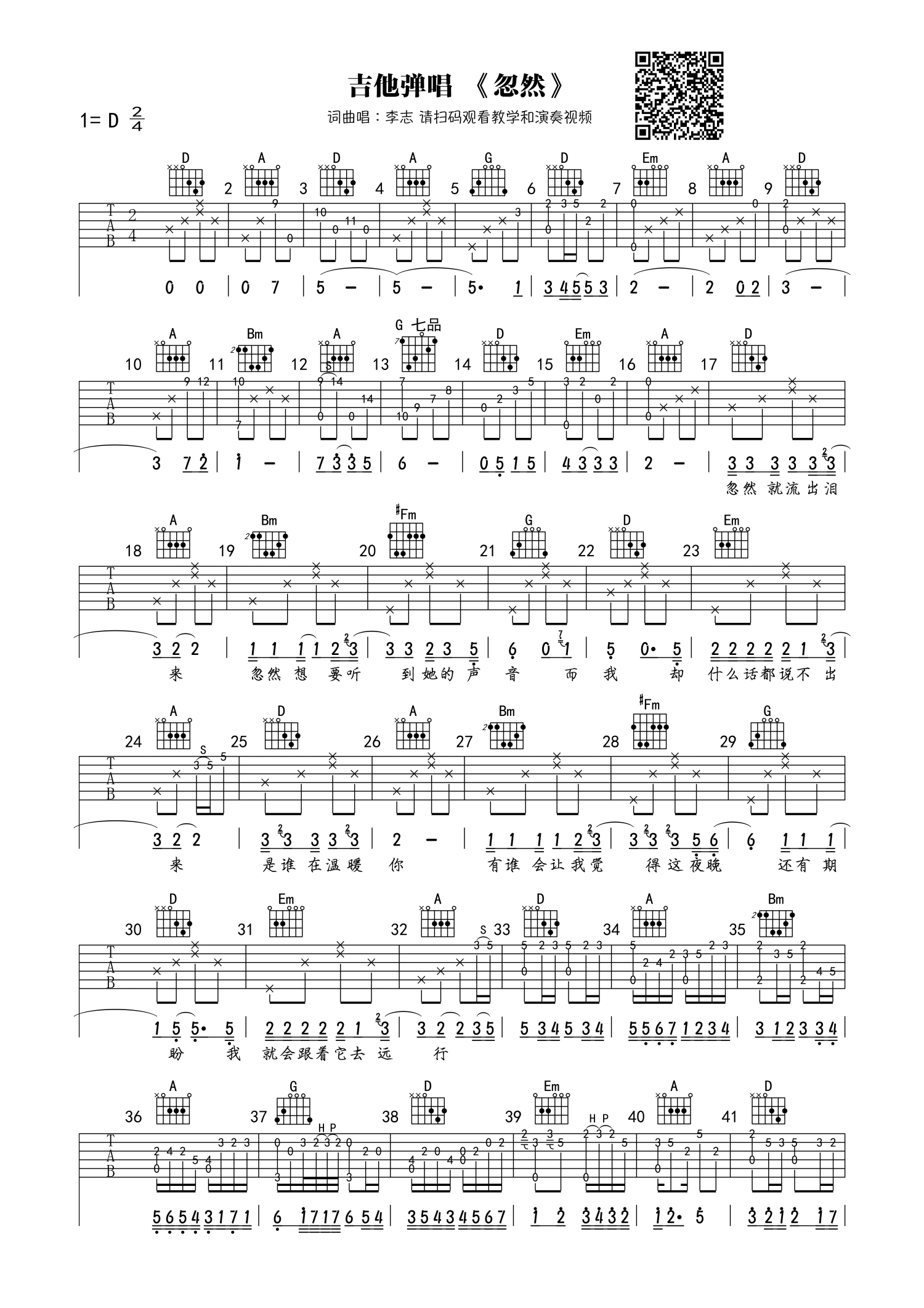 • 忽然吉他谱 - 李志 - D调吉他弹唱谱第1张