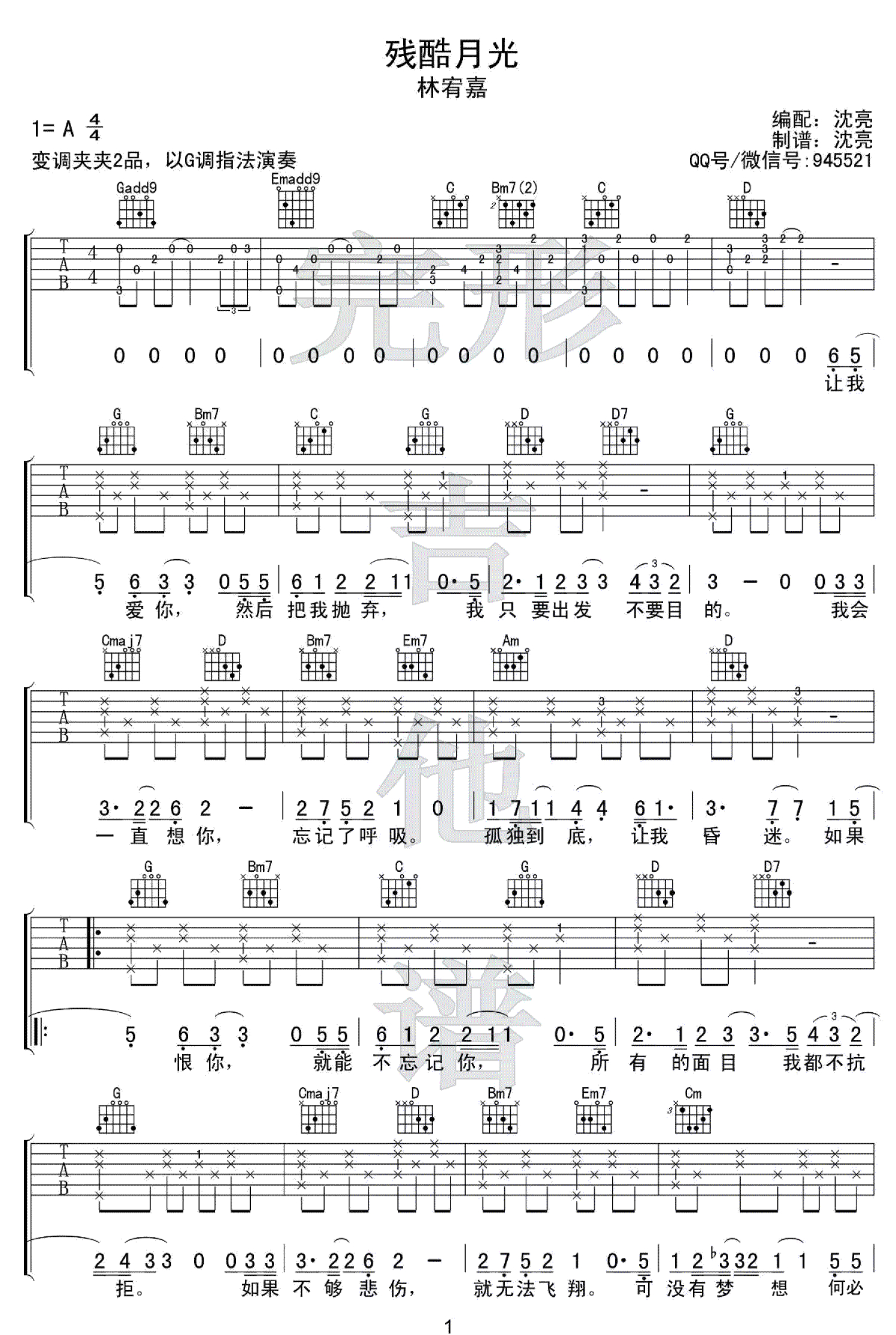 曲谱介绍: 林宥嘉《残酷月光》吉他谱,变调夹夹第二品,以G调指法演奏。本曲谱的版本,以一把吉他编配,模仿钢琴柱式和弦伴奏方式的手法,在整体编配方向上尽量回归原版。该伴奏方式在吉他上的表现简单且灵活,是吉他爱好者必学伴奏手法,在诸多歌曲中都有体现。