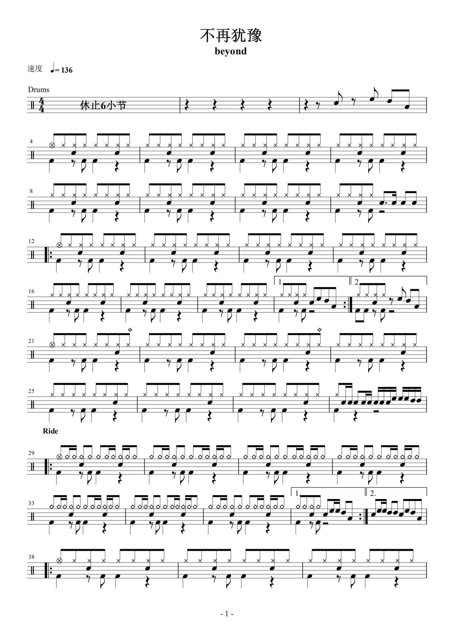 • 不再犹豫鼓谱 - Beyond - 架子鼓谱第1张