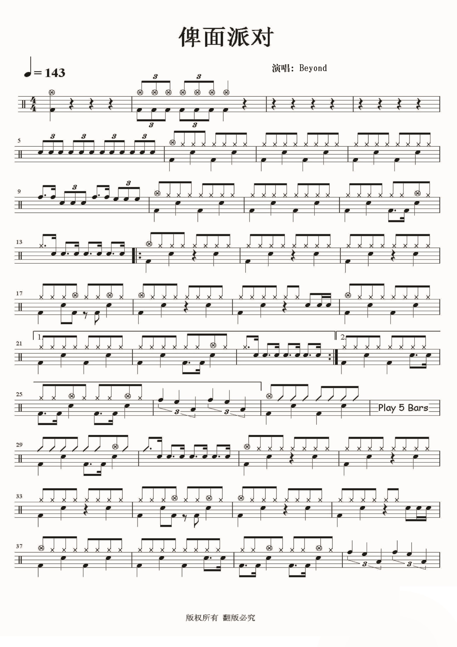 • 俾面派对鼓谱 - Beyond - 架子鼓谱第1张