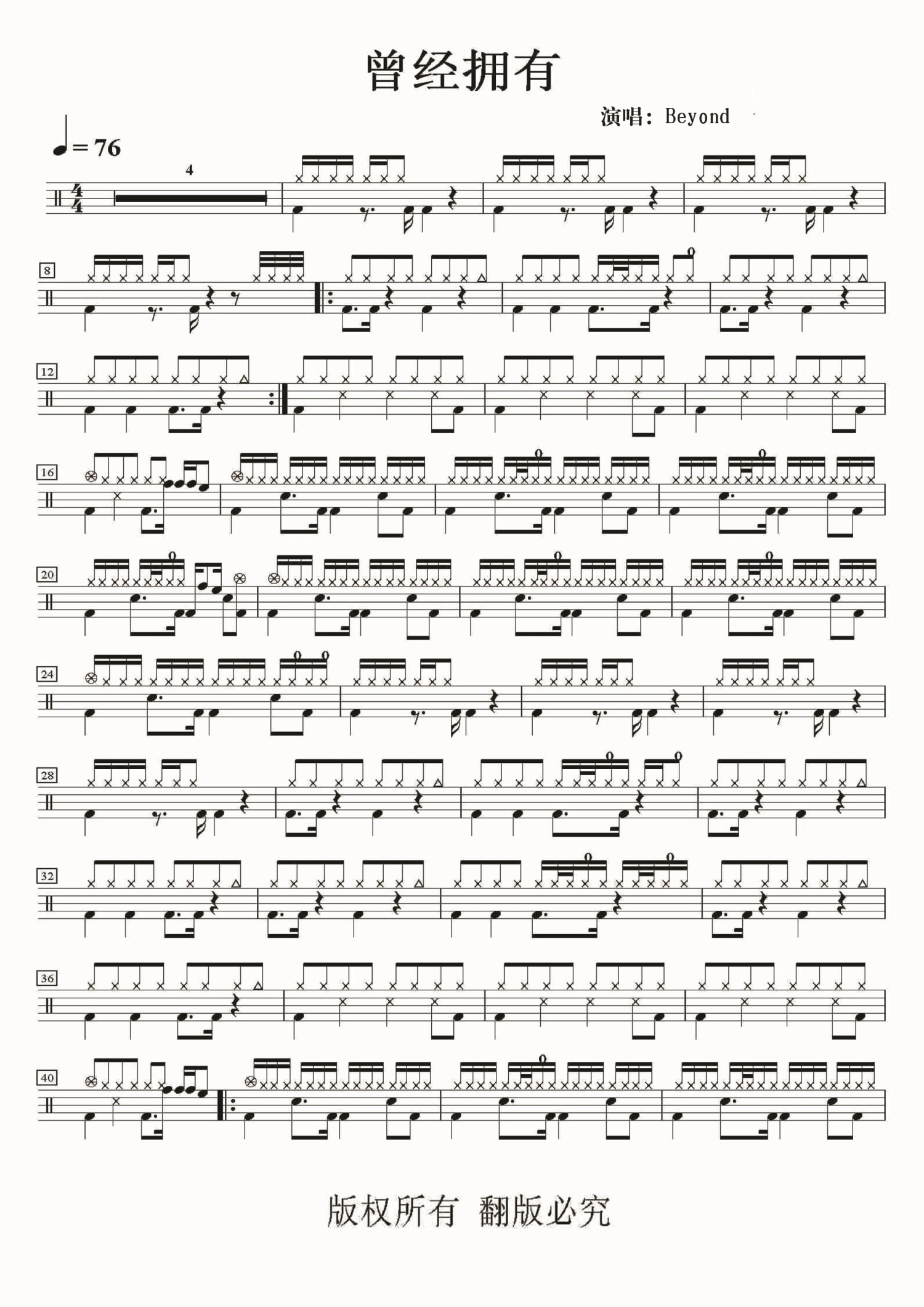 • 曾经拥有鼓谱 - Beyond - 架子鼓谱第1张