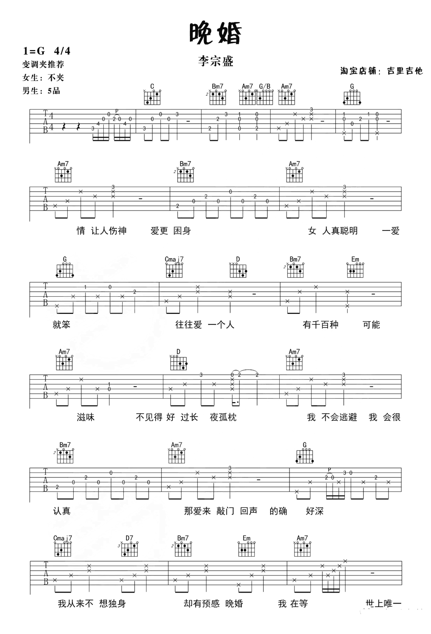 曲谱介绍: 李宗盛《晚婚》吉他谱,G调指法弹唱谱,变调夹推荐,女生不夹,男生夹五品。前几天谭维维在《梦想的声音》节目舞台深情演唱《晚婚》,让大哥这首冷门歌曲被我们知晓,很多人都觉得太好听了,可惜网上没有吉他弹唱谱子,所以作为大哥迷的彭老师为大家扒出了这首歌,并录制了视频供参考。《晚婚》吉他弹唱演示视频