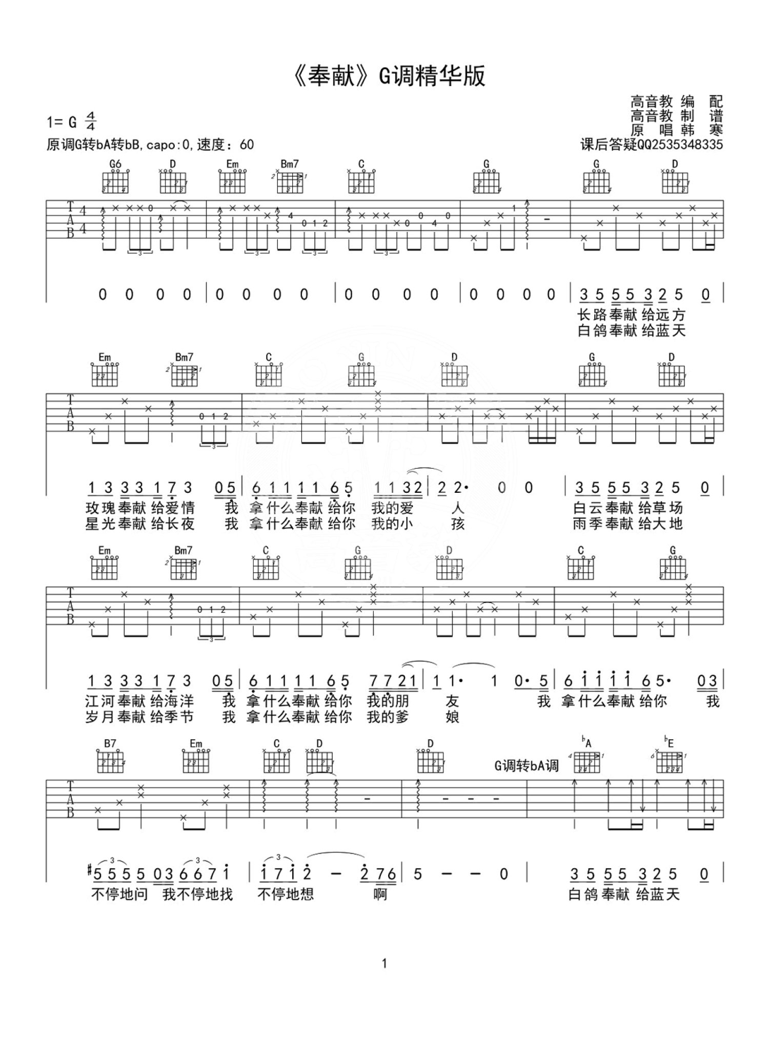 曲谱介绍: 奉献吉他谱,苏芮的一首经典老歌,韩寒献唱电影《飞驰人生》片尾曲,原调G转bA调,女生调capo:4,男生调capo:0,具体以个人嗓音来决定。长路奉献给远方,玫瑰奉献给爱情……最温和的旋律和最简单的歌词,歌颂我们的平凡又充满热爱的一生,戳到每个人心最柔软处。一首歌唱出了一人一生的责任,给爱人、朋友、孩子、父母,人的可爱之处也在于享受奉献的过程。
