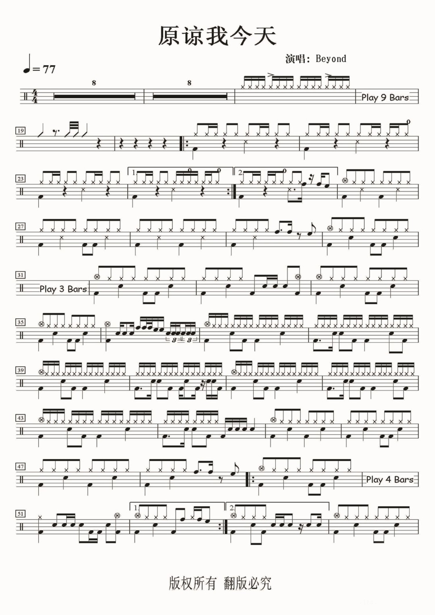 原谅我今天鼓谱 - Beyond - 架子鼓谱