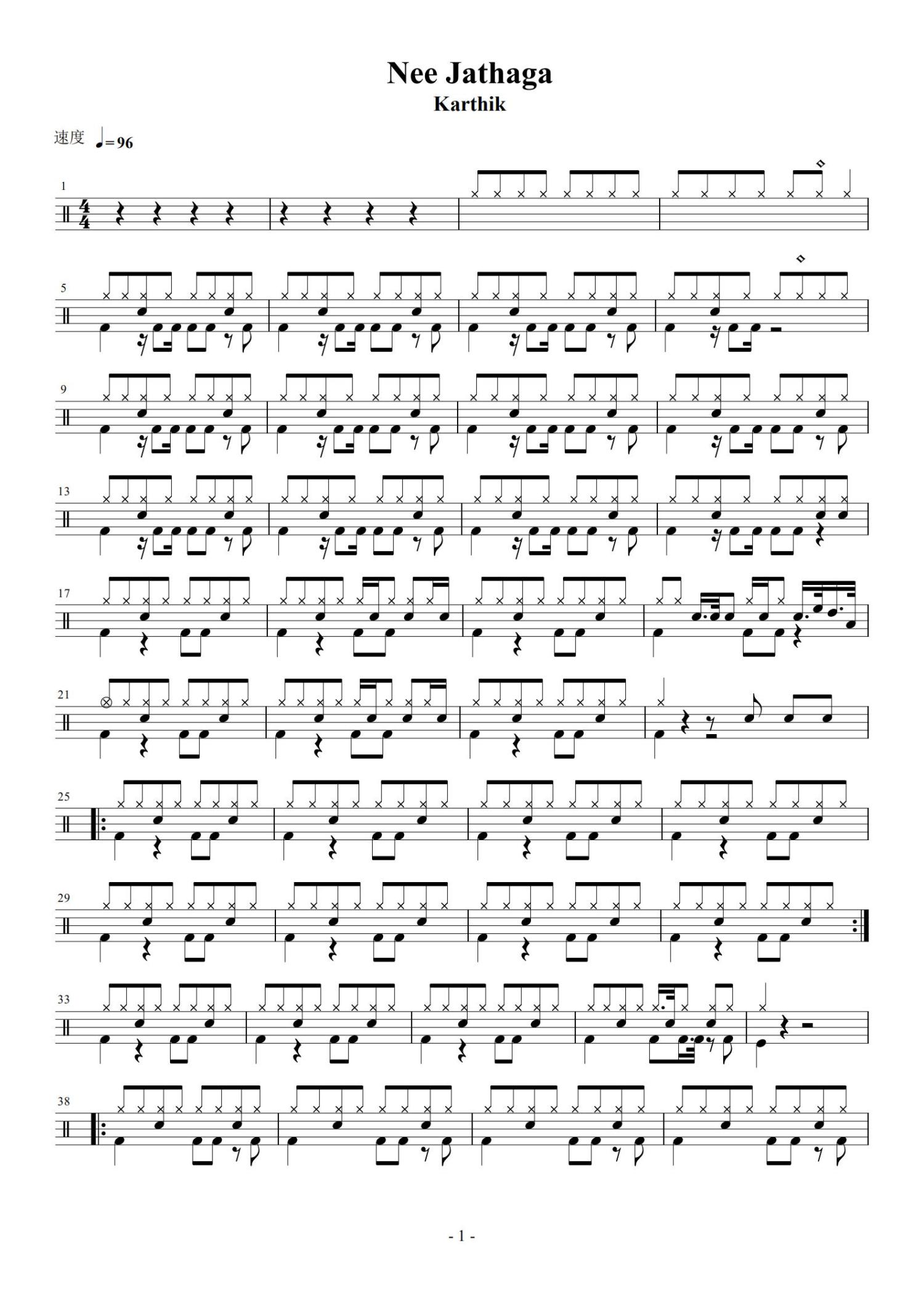 • Nee Jathaga鼓谱 - Karthik/Shreya Ghoshal - 架子鼓谱第1张
