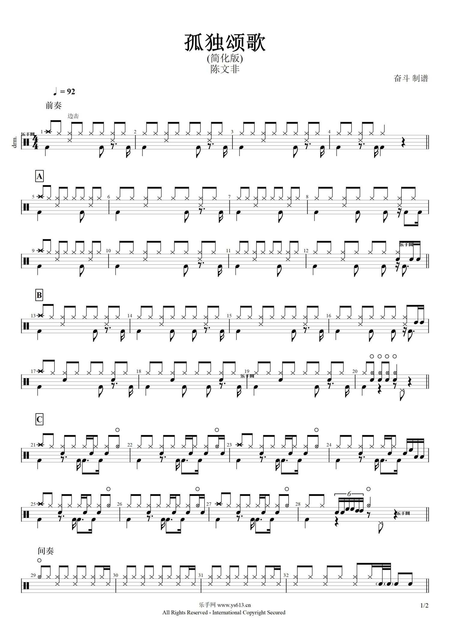 • 孤独颂歌鼓谱 - 陈文非 - 架子鼓谱 - 简化版第1张