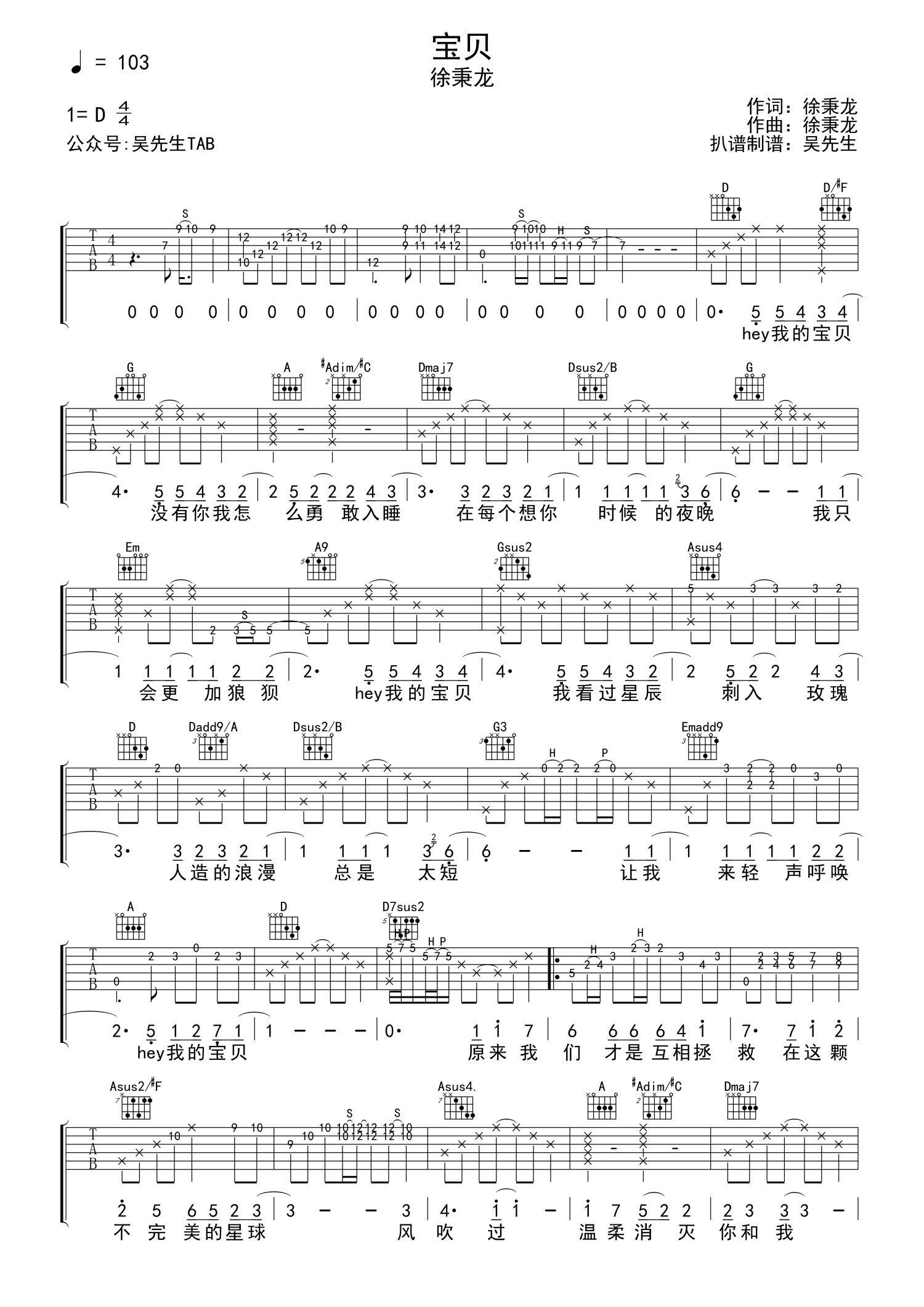 • 宝贝吉他谱 - 徐秉龙 - C调吉他弹唱谱第1张