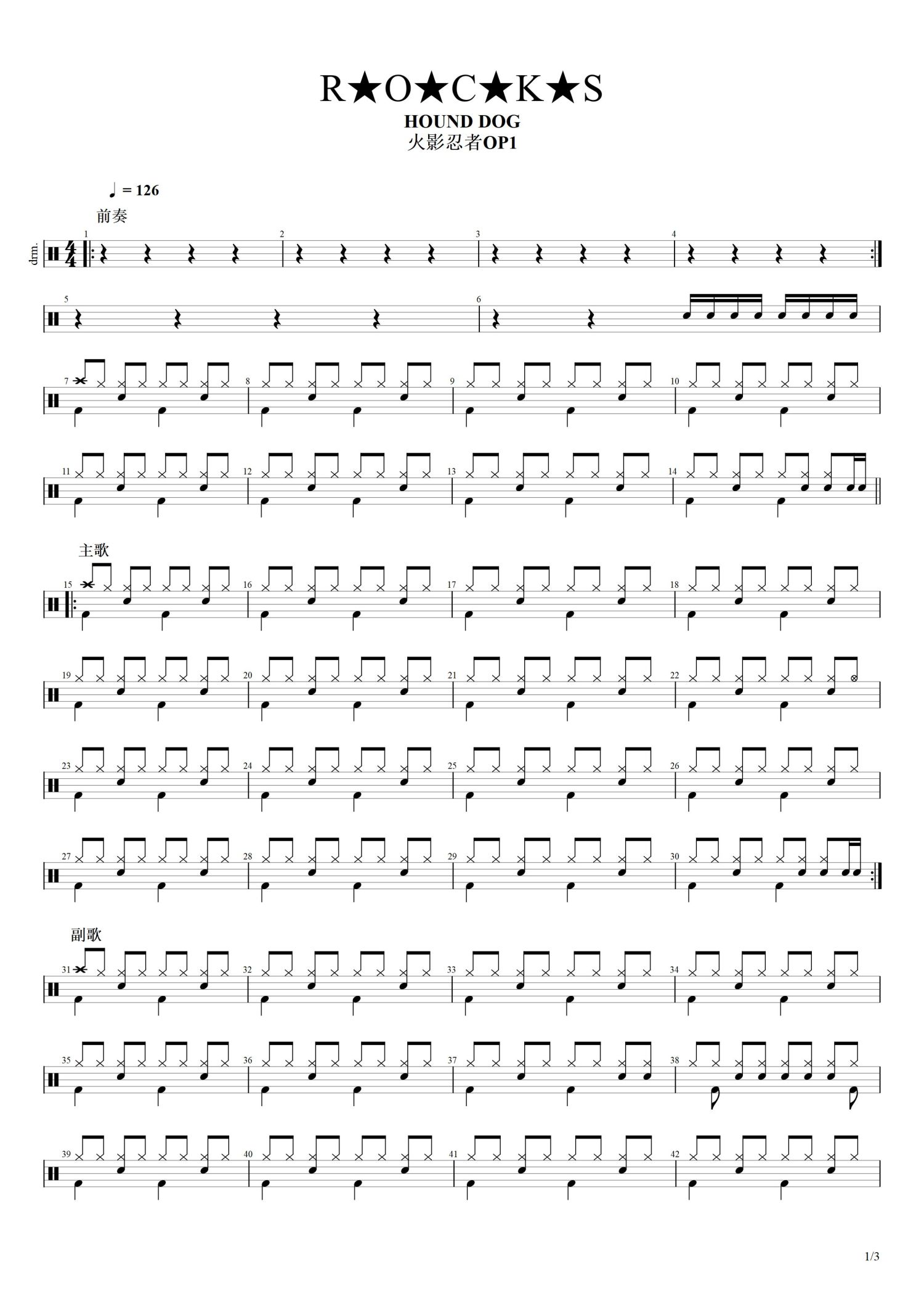 • R★O★C★K★S火影忍者OP1)鼓谱 - HOUND DOG - 架子鼓谱第1张