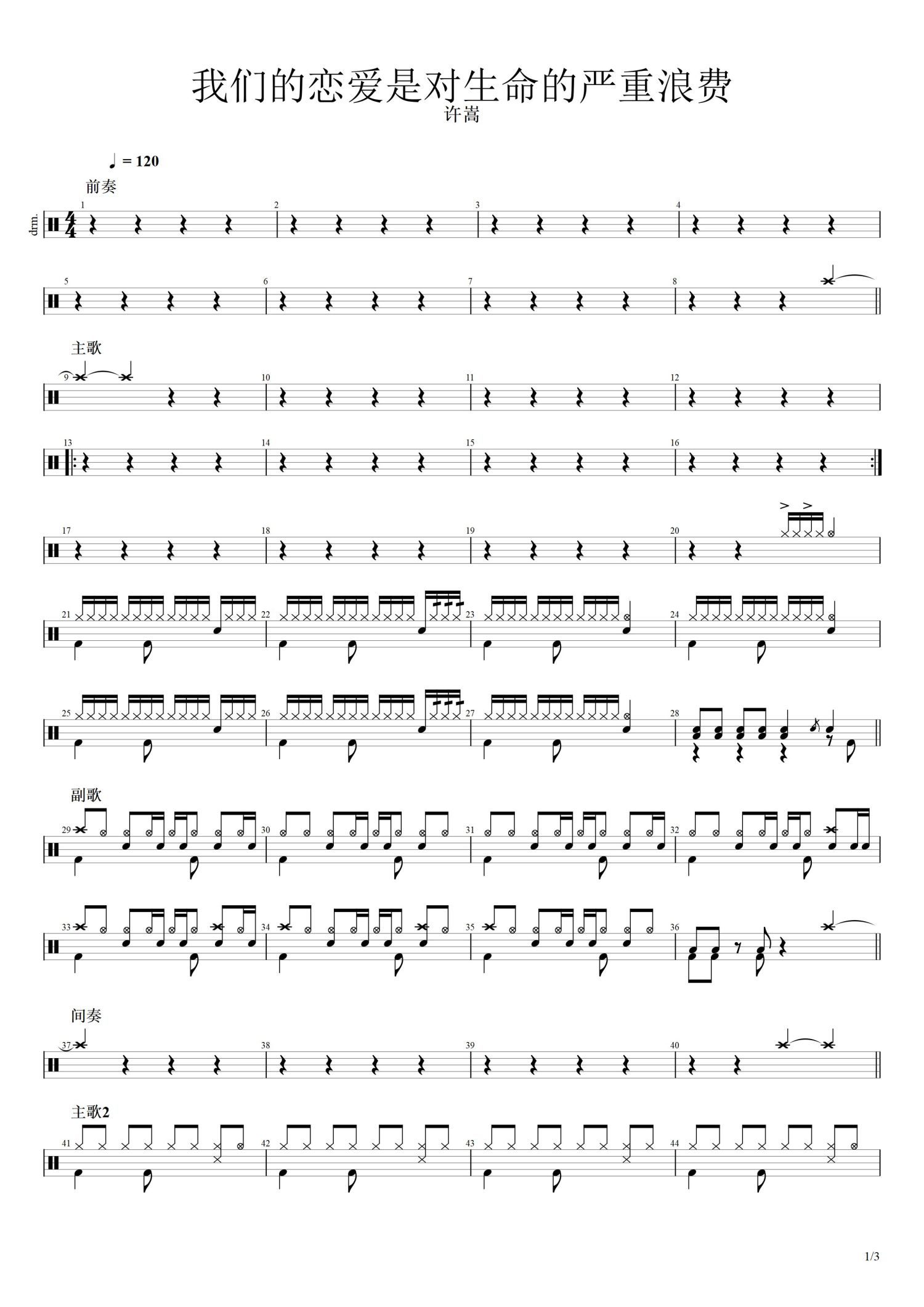 • 我们的恋爱是对生命的严重浪费鼓谱 - 许嵩 - 架子鼓谱第1张