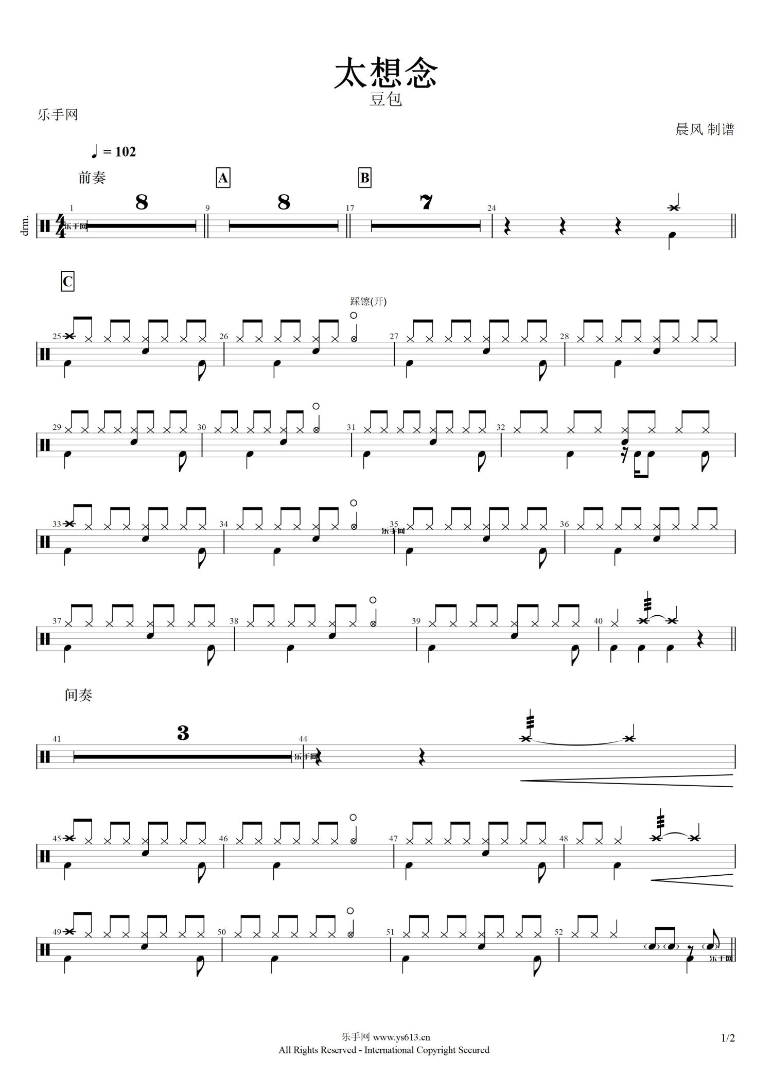 • 太想念鼓谱 - 豆包 - 架子鼓谱第1张