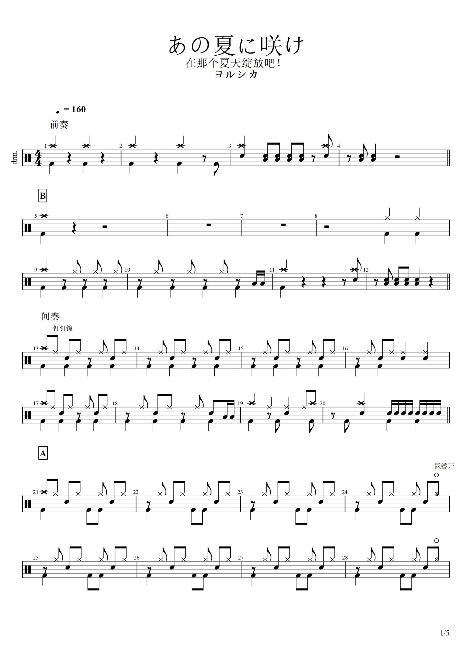 • あの夏に咲け(在那个夏天绽放吧)鼓谱 - ヨルシカ - 架子鼓谱第1张