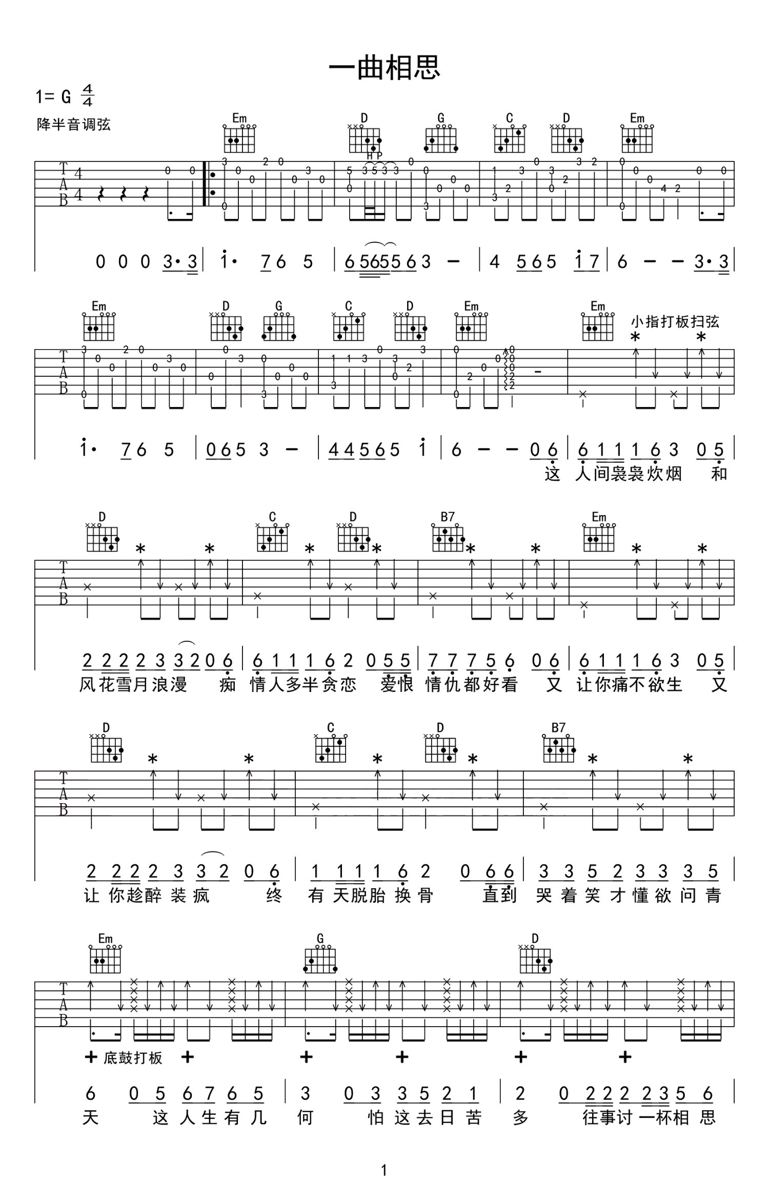 曲谱介绍: 一曲相思吉他谱,半阳演唱,G调降半音调弦,抖音小姐姐阿悠悠翻唱,让这首歌曲红遍网络。一曲相思,半壶酒。一生所爱,一场空。