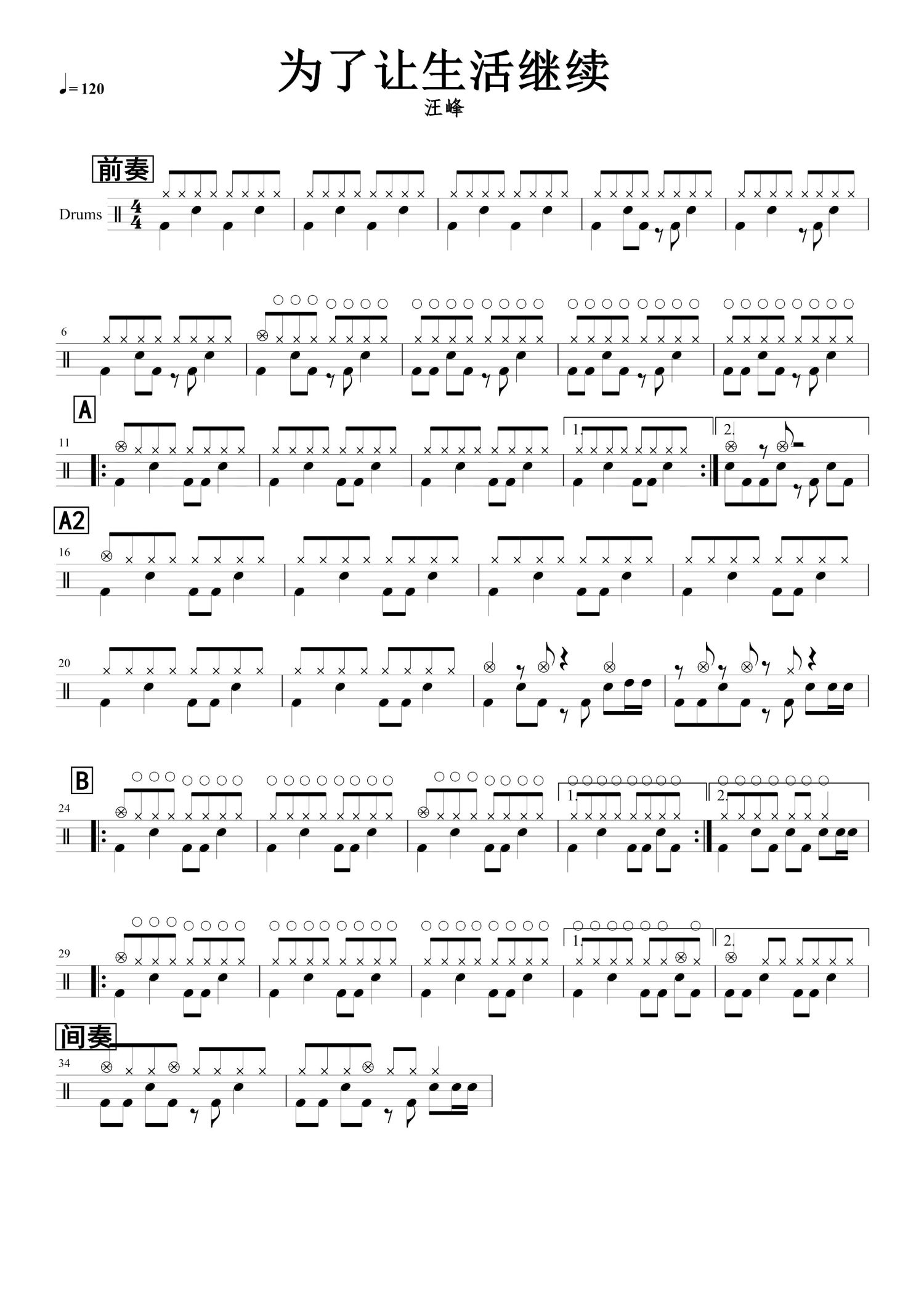 • 为了让生活继续鼓谱 - 汪峰 - 架子鼓谱第1张